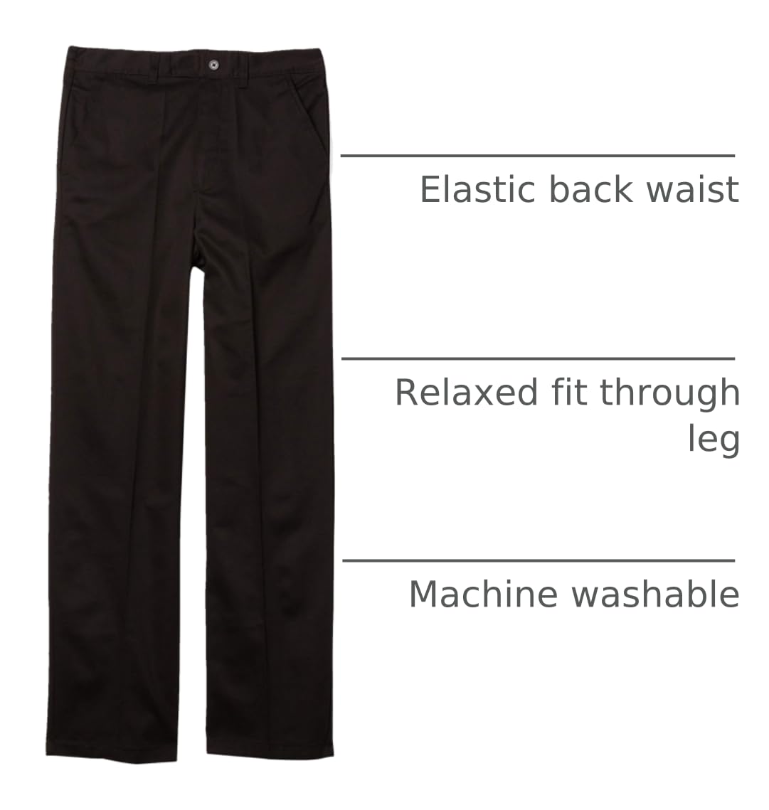 Description These French Toast Boys Pull-On School Uniform Pants are made to match the energy of growing boys while meeting the practical needs of parents and caregivers. Whether it's for the first day of kindergarten, a school recital, or simply everyday classroom wear, these pants are designed to keep him looking sharp and feeling comfortable from morning to night. Made from a soft stretch cotton-blend twill, they move easily with every hop, skip, and jump. Reinforced Power Kneesยฎ mean theyโll last through recess and beyond, while the mock fly and non-functional front button give the tailored appearance of traditional trousers with none of the struggle. The elastic back waistband allows for pull-on ease, making these pants a great option for kids still learning to dress themselvesโor for busy mornings when every second counts. Featuring functional belt loops, front slash pockets, and a rear welt pocket, these pants blend uniform-ready style with everyday utility. Parents will love that theyโre machine washable, wrinkle-resistant, and built to last. Kids will love the comfort, flexibility, and no-fuss fit. Perfect for school uniforms, picture day outfits, holiday events, or family celebrations, these trousers are also ideal for any occasion where comfort and polish matter. Call them slacks, school pants, chinos, or dress pantsโwhatever you name them, these are a wardrobe essential for any young boy.