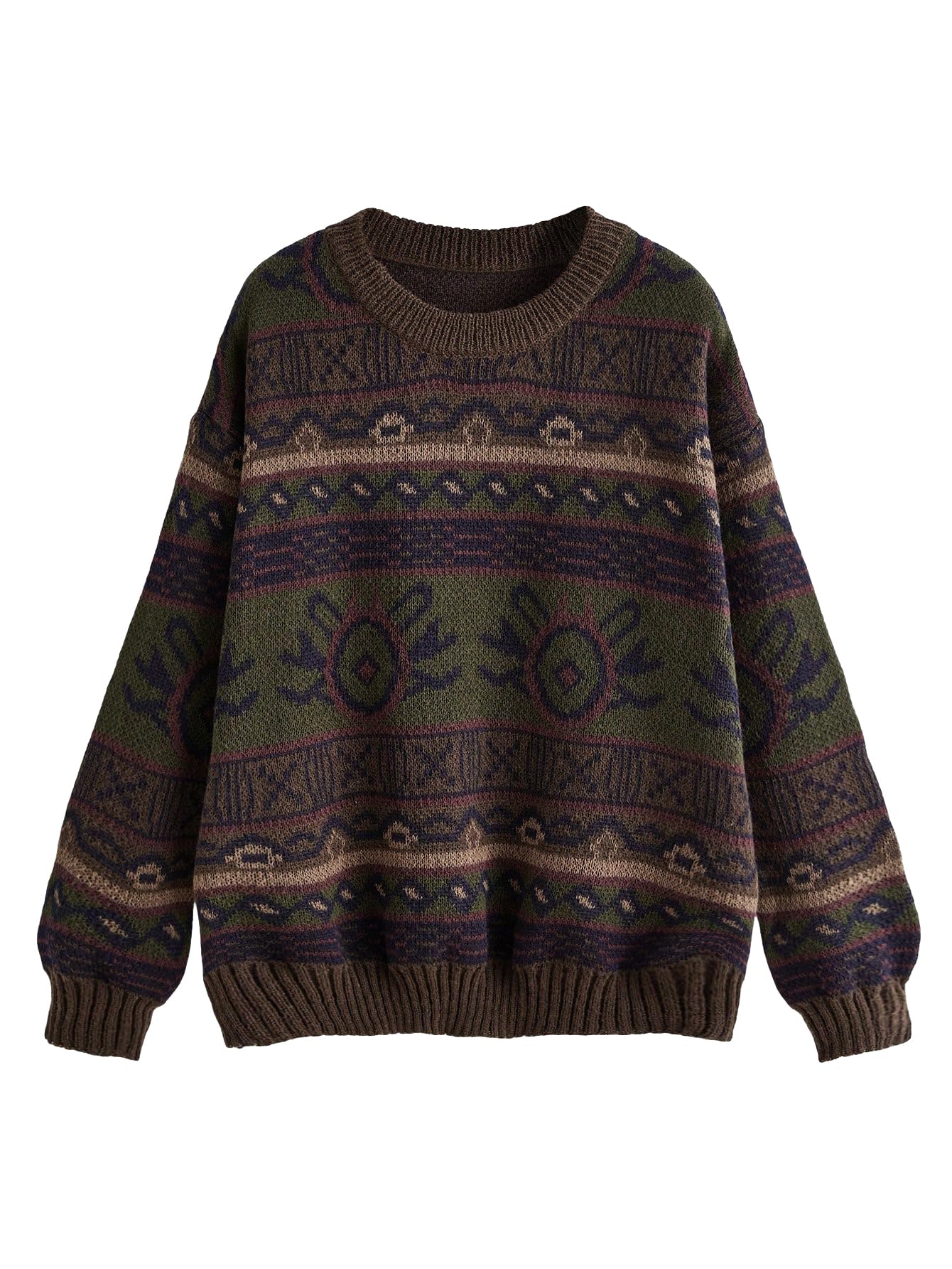 Feature: geo pattern, round neck, long sleeve, oversized pullover sweater for women
