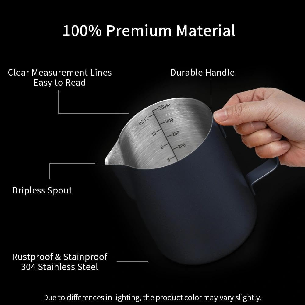 INSIDE SCALE LINES MEASURING: The milk pitcher has clear inside measurement lines(ml/oz), making it easier to control the amount of milk or cream per cup of coffee. 12/20/32/50oz milk frother pitcher can satisfied your different demands. Ideal for foaming or steaming milk, used in espresso and cappuccinos, it can be used for any liquid measuring like water, juices, batter mixes, smoothies etc.
