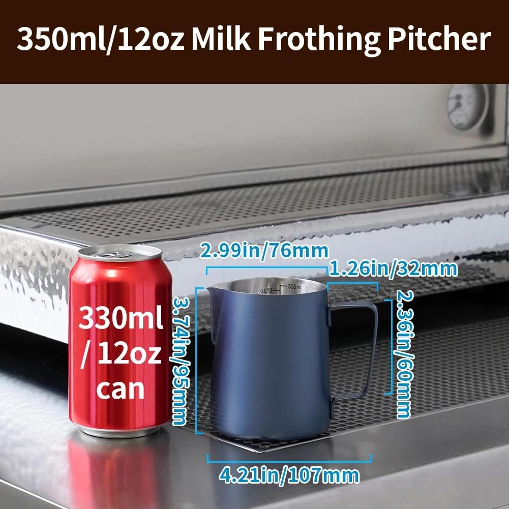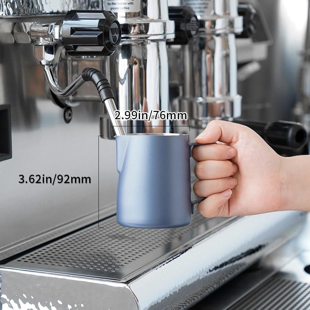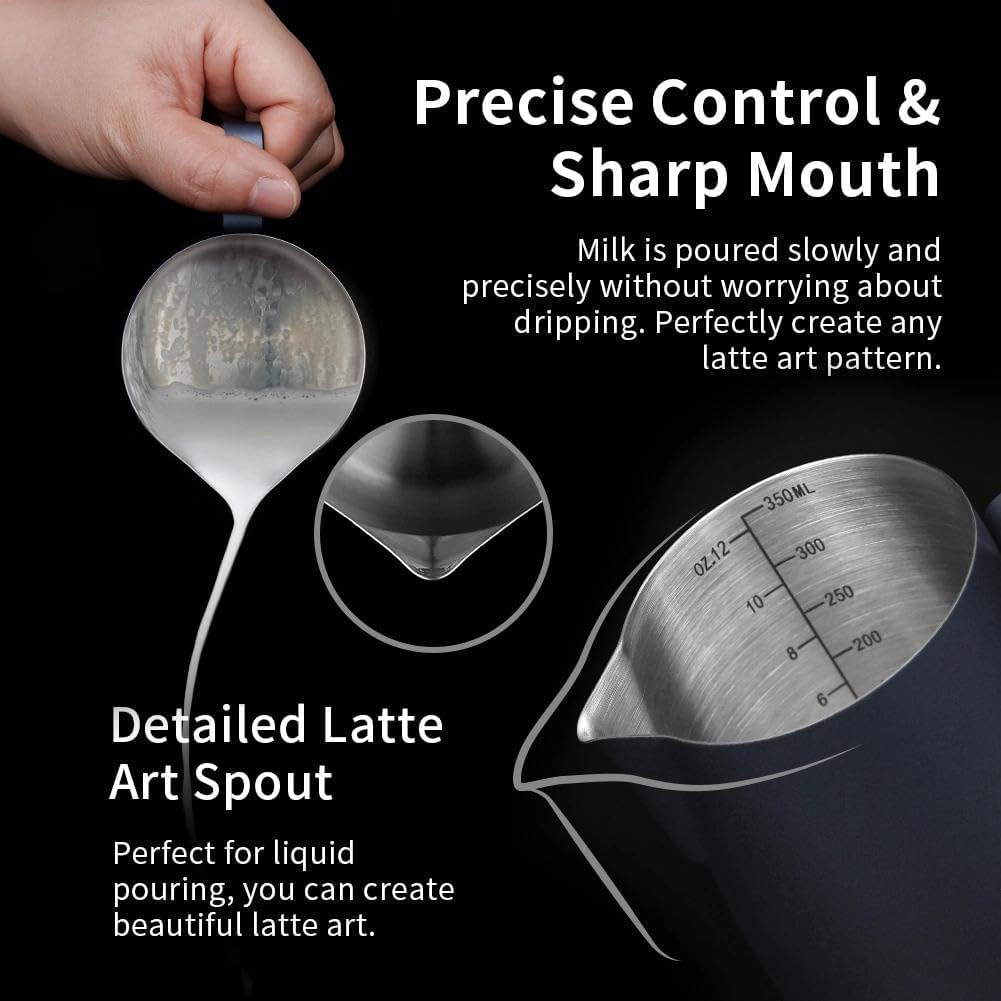 MAKE PERFECT LATTE ART: The milk pitcher ensures that the milk froth is poured slowly and precisely without dripping. Perfect frother cup for making frothing or steaming milk for espresso, cappuccino or hot chocolate. It provides you with a precious control of pouring, easy to create a perfect latte art! Perfect for both professional baristas and novice coffee lovers. PREMIUM MATERIAL: watchget milk frothing pitcher is made of food grade 304 stainless steel with Blue coating which is durable and sturdy, wear-resistant and heat resistant. Unbreakable for daily use and can serve you a long time. Easy to clean and use, it offers excellent temperature control. ERGONOMIC HANDLE: The handle provides with a easy grip and precise control of pouring speed and direction, beginner friendly. INSIDE SCALE LINES MEASURING: The milk pitcher has clear inside measurement lines(ml/oz), making it easier to control the amount of milk or cream per cup of coffee. 12/20/32/50oz milk frother pitcher can satisfied your different demands. Ideal for foaming or steaming milk, used in espresso and cappuccinos, it can be used for any liquid measuring like water, juices, batter mixes, smoothies etc. DRIPLESS SPOUT DESIGN: The dripless spout allows you pour milk foam smoothly and precisely without dripping. You can practice and create your own beautiful latte artwork easily! Please note that the volume indicated in the milk pitcher is only the maximum capacity, not the optimal capacity. Due to the need for frothing and other steps, it is not advisable to fill the pitcher too full.