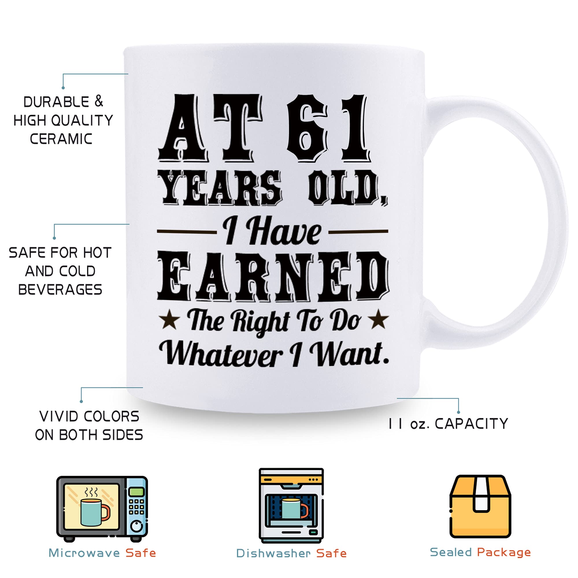 💖 BEST 61ST BIRTHDAY GIFT - The saying “AT 61 YEARS OLD, I Have EARNED The Right To Do Whatever I Want.” was printed on both sides of the 61st birthday mug. 61st Birthday Mug is a great gift idea for a grandma and grandpa who is going to celebrate their 61 years old soon. This mug is a Vintage Birthday Gift for senior Men and Women that will make them laugh.