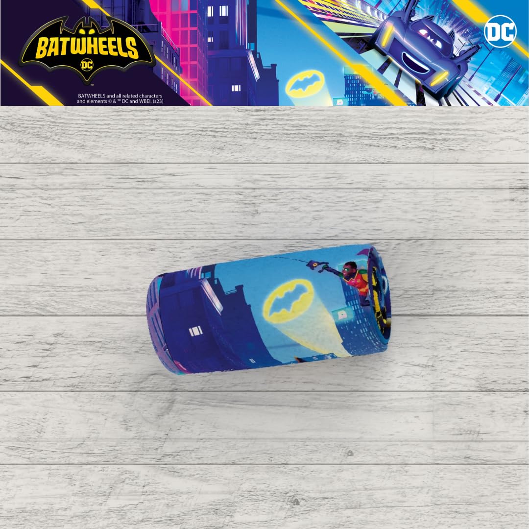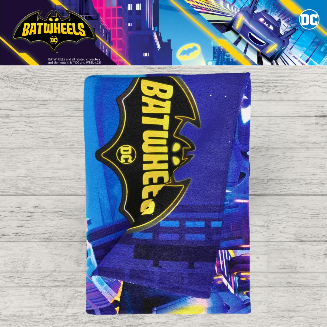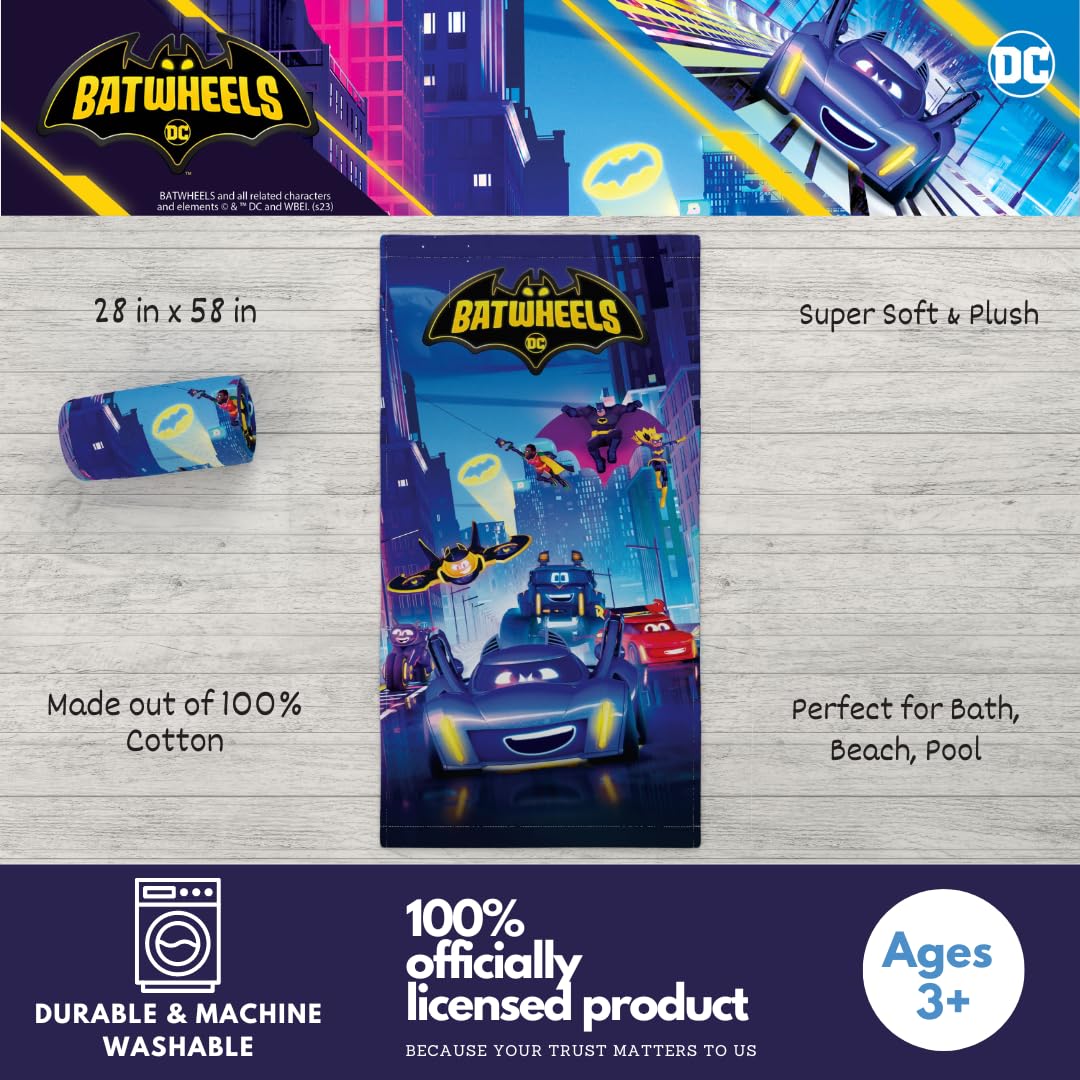 BATWHEELS DESIGN: When it comes to bathing and swimming, the superheroes and super vehicles of Batwheels provide the perfect backup with this eye-catching beach towel. The colorful characters from the WB animated series race into action against a Gotham City backdrop on this high-quality towel.