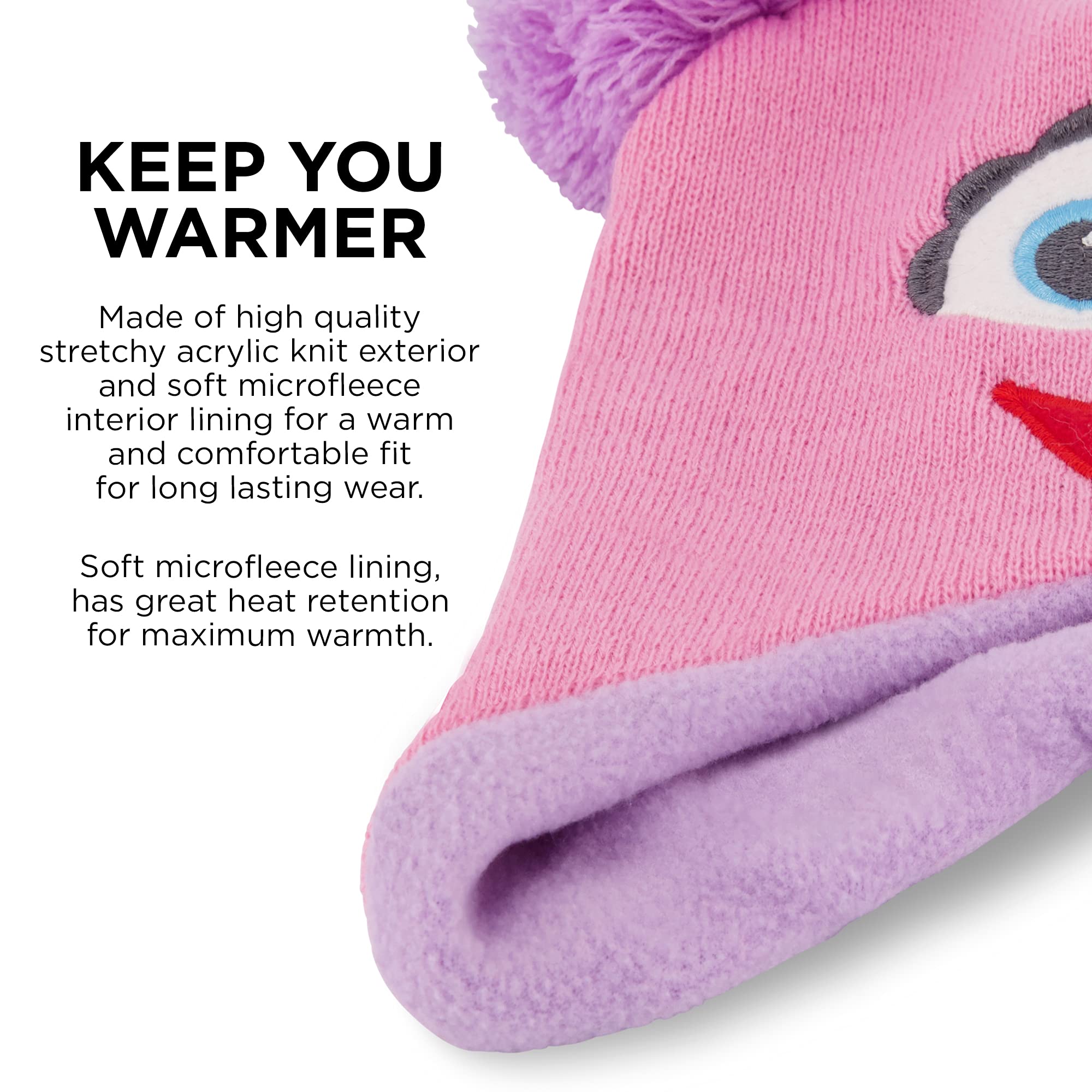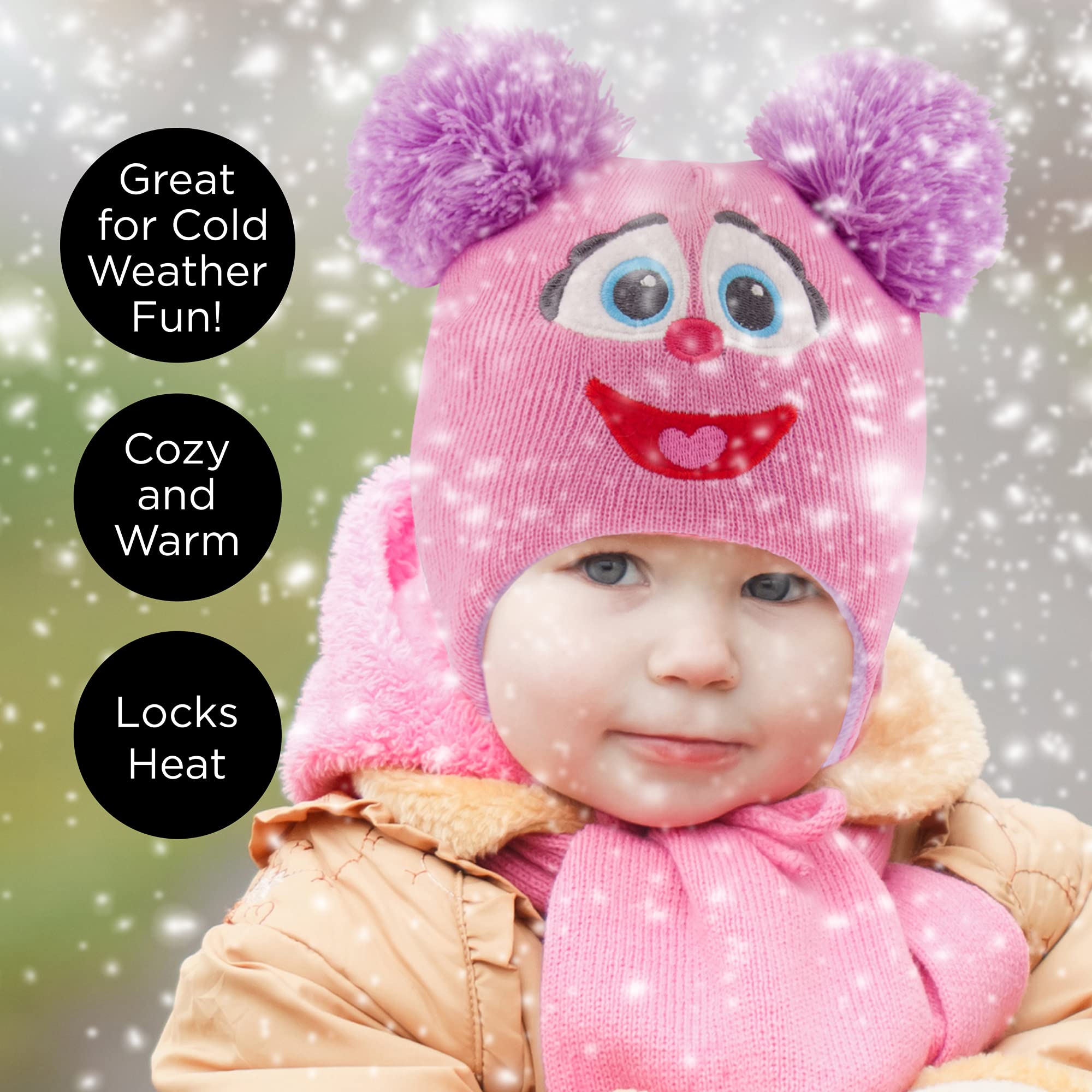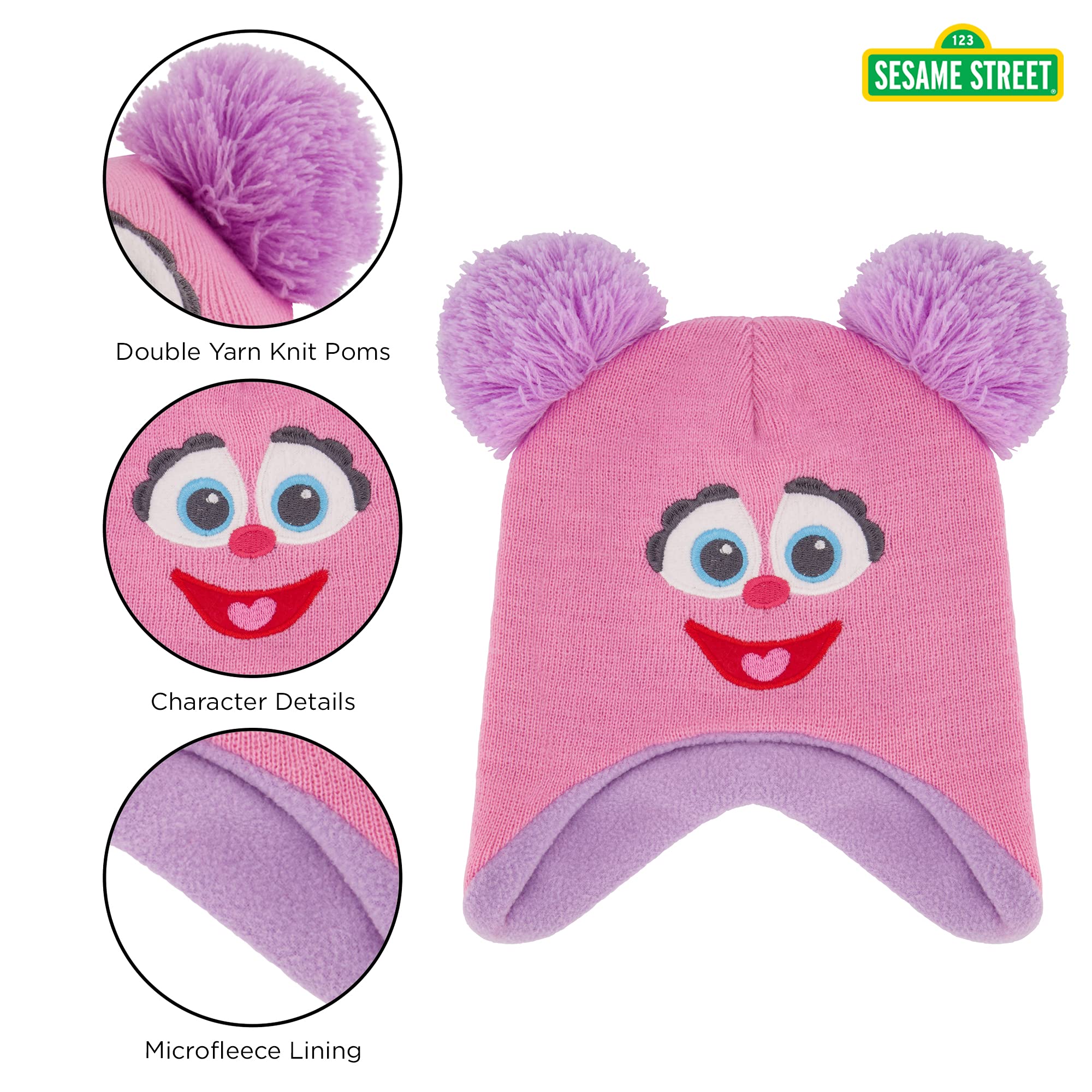 FUN AND FASHIONABLE: Featuring colorful Abby Cadabby imagery from Sesame Street with fluffy purple Pom Poms, this cute and comfy cold-weather baby beanie accessory set is all your little Abby Cadabby fan will want to wear all winter. With Abby Cadabby at her side to keep her hands warm, she'll be ready for fun and adventure on even the snowiest days.