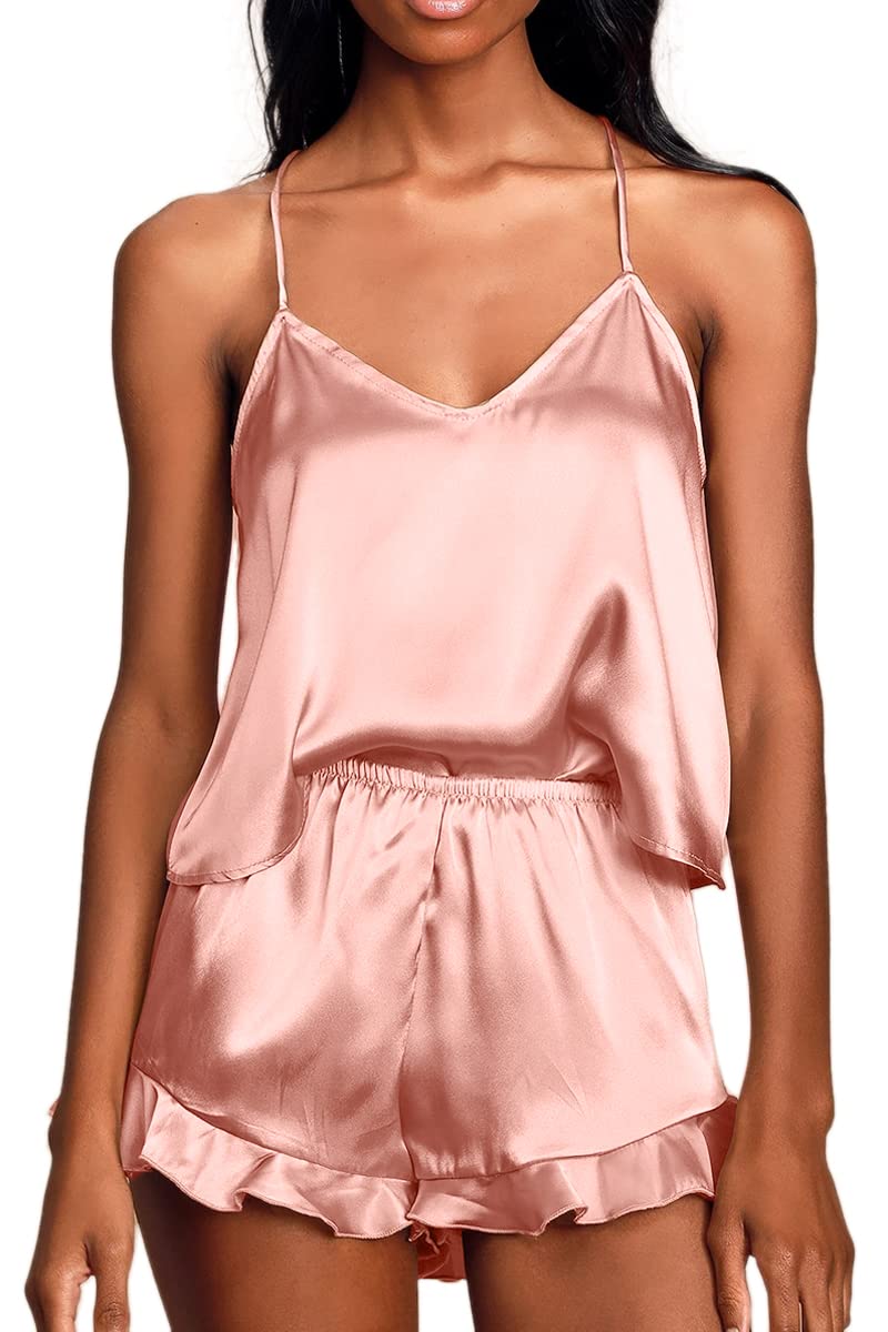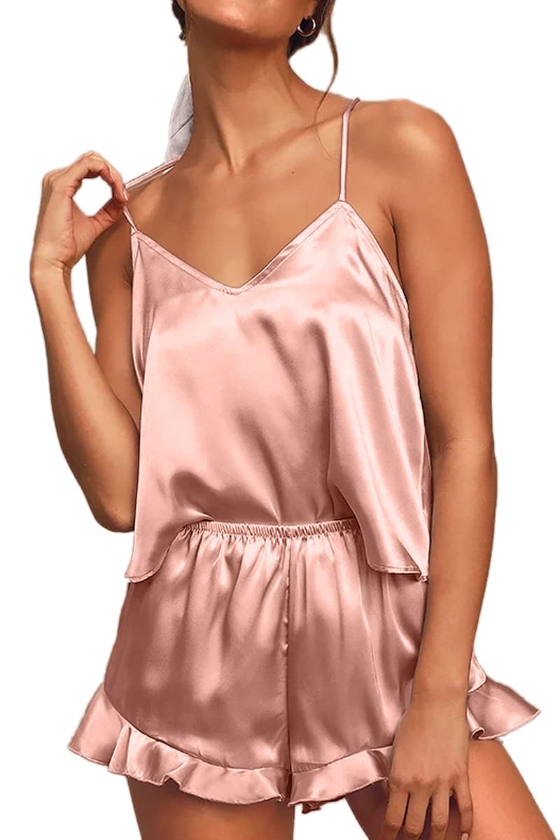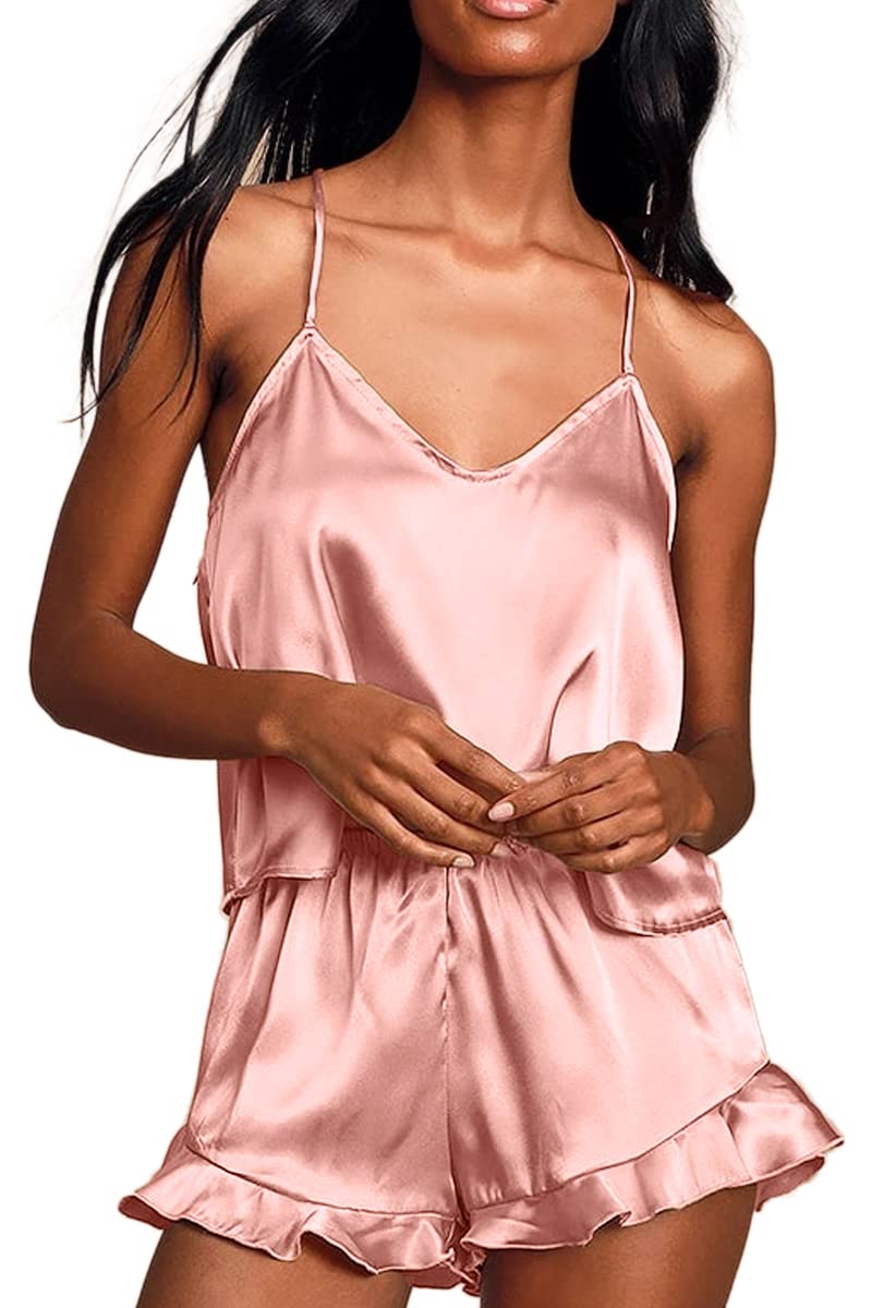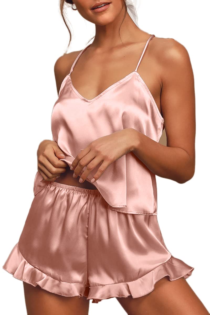 The cute satin silk cami pajamas tops features v neck,low cut,racerback,adjustable straps,the shorts features high waisted,elastic waist,casual loose style.The cute and sexy pajamas sets will make you look more flattering,elegant for your sweet night.