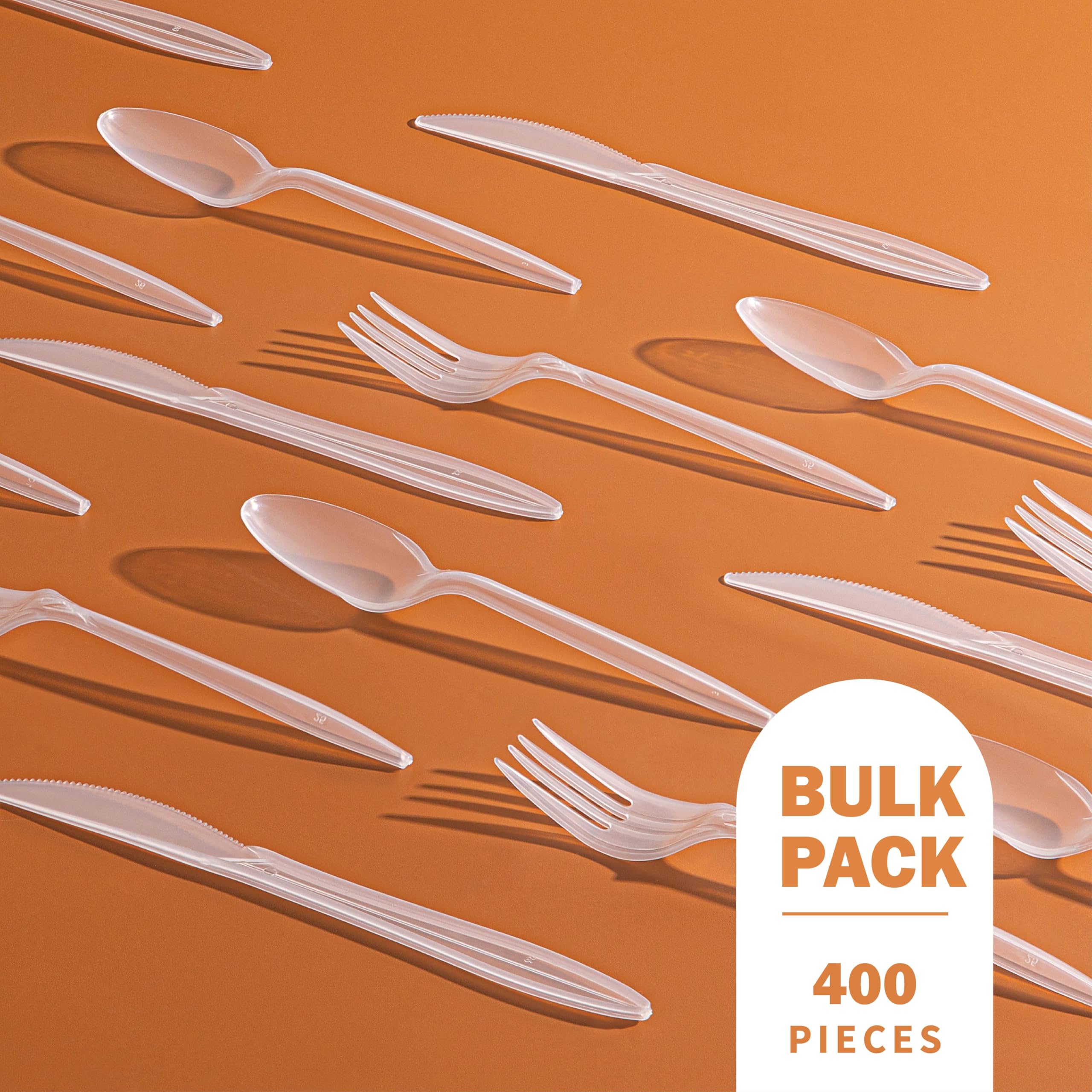 Bulk Pack disposable cutlery includes 400 pieces: 160 transparent plastic tea spoons, 160 transparent plastic forks, and 80 clear plastic knives.