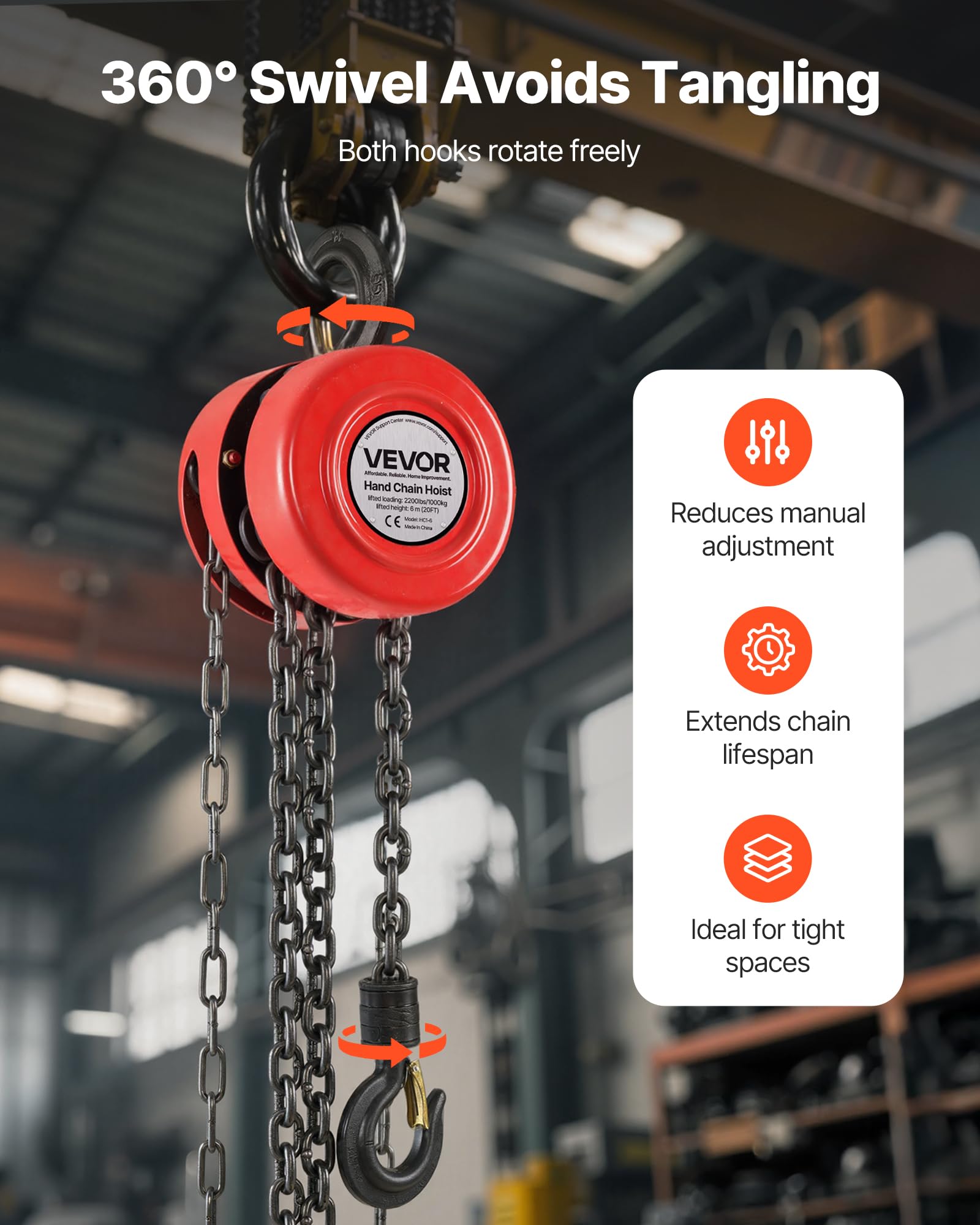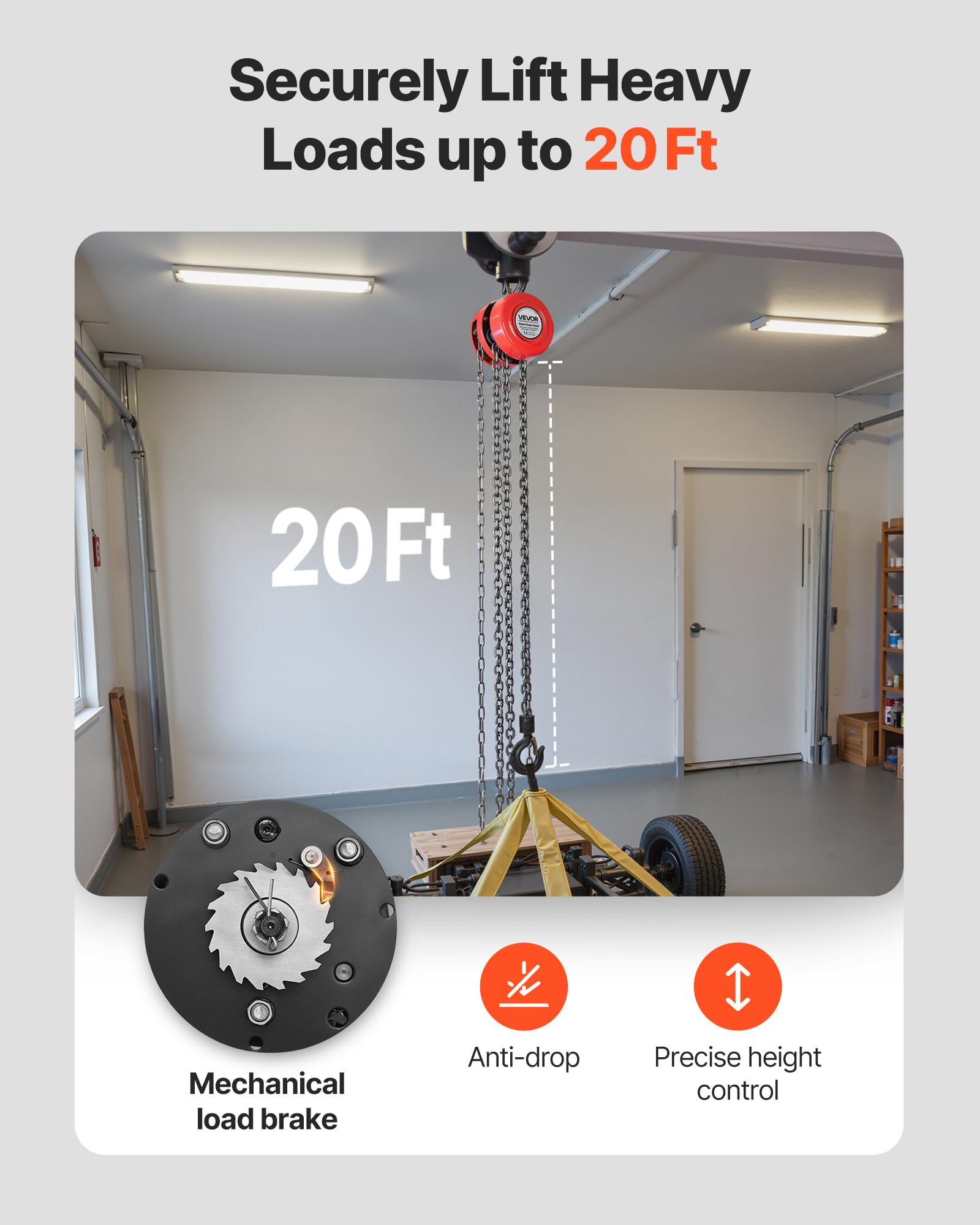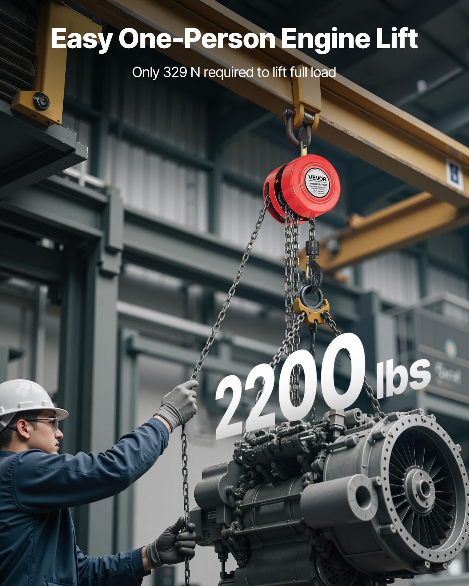 2200 lbs Heavy Duty Capacity: This hand chain hoist easily handles heavy lifting tasks, supporting up to 2200 lbs (1 T) and reaching heights up to 20 ft (6 m). Ideal for garages, construction sites, and warehouses