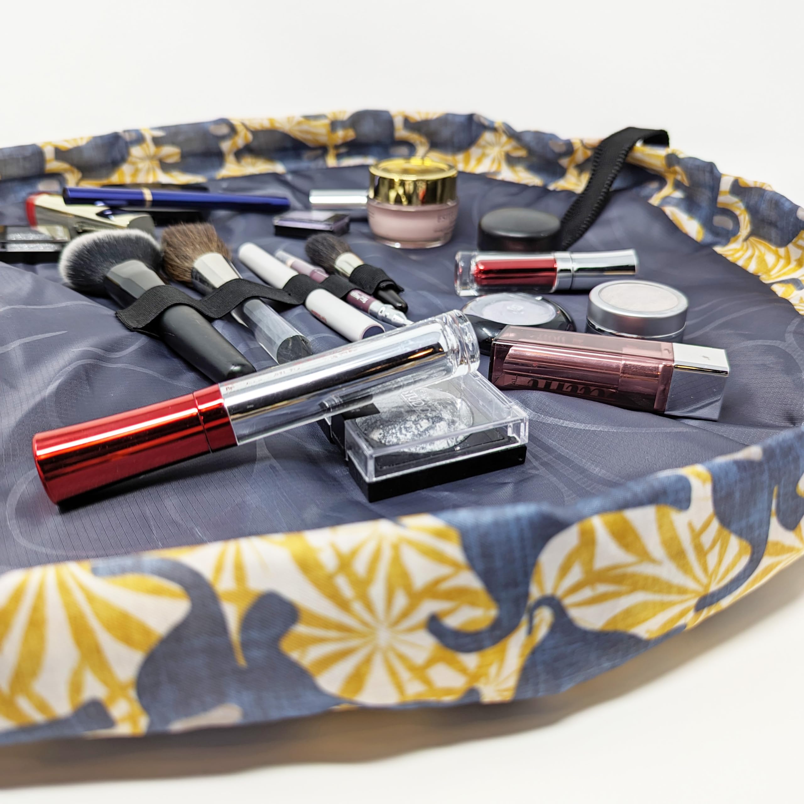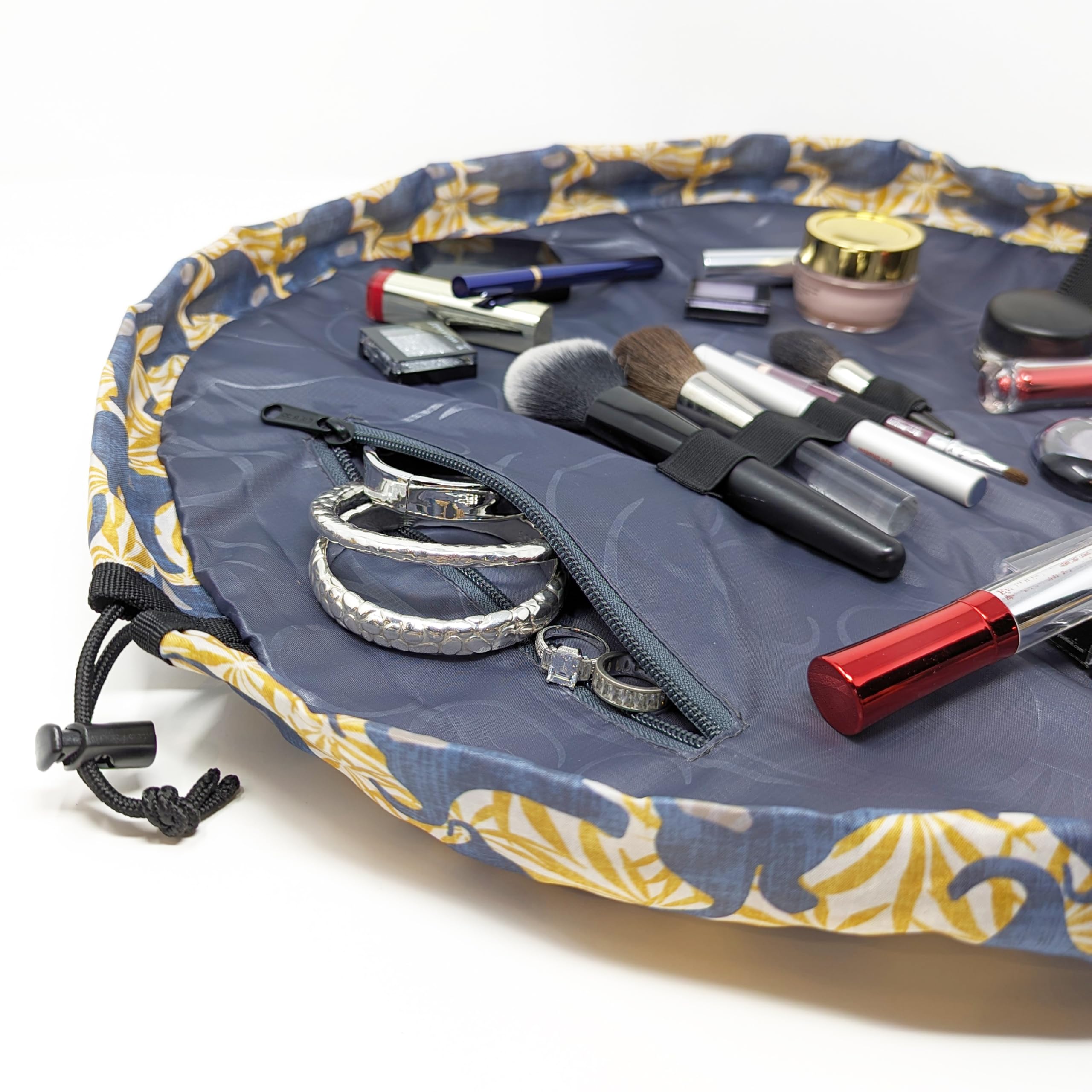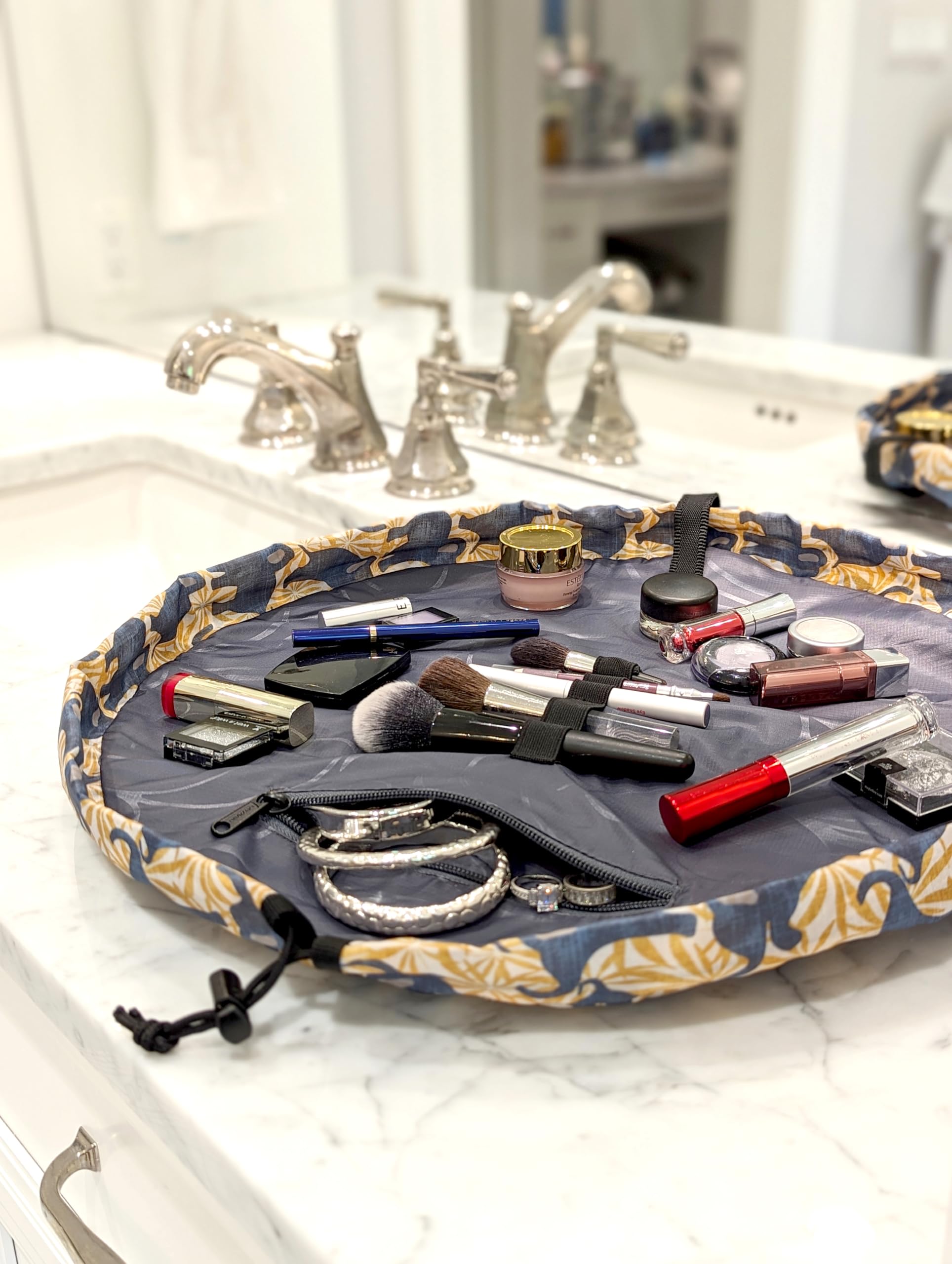 FAST CLEANUP, NO MESS: Lay flat to instantly access all your makeup, then cinch closed for effortless cleanup – no more digging through cluttered bags or bathroom counters.