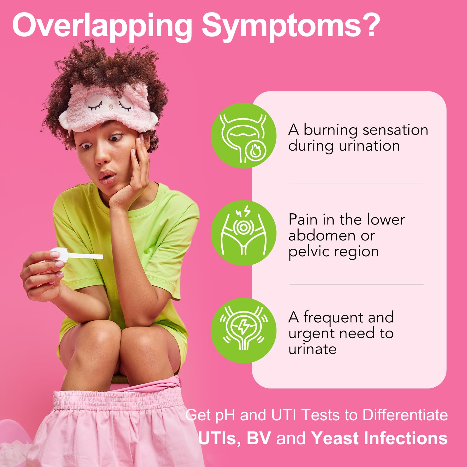Vaginal pH and UTI Test Kit: Not only detects NIT and LEU for urinary tract infections (UTIs), but also includes a vaginal pH test to help identify if your symptoms are caused by yeast infections, bacterial vaginosis (BV), or other vaginal health issues. Perfect for women's feminine health monitoring at home