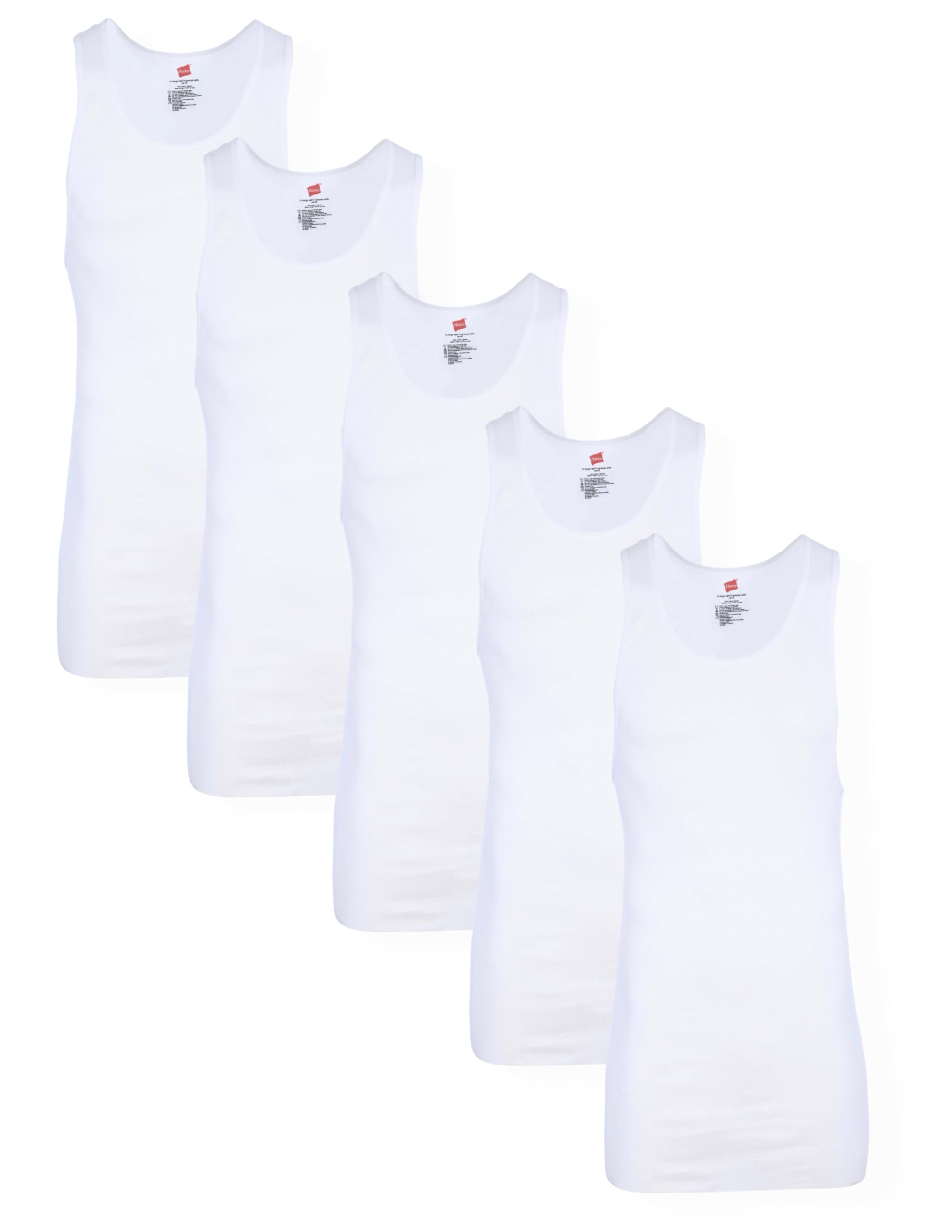 Generous length for a stay-tucked hem, featuring a lay flat collar. This tank will be a staple in your wardrobe. Available in a convenient 3 or 5-pack in mutliple colors like white, black and grey. Tag free for comfort.