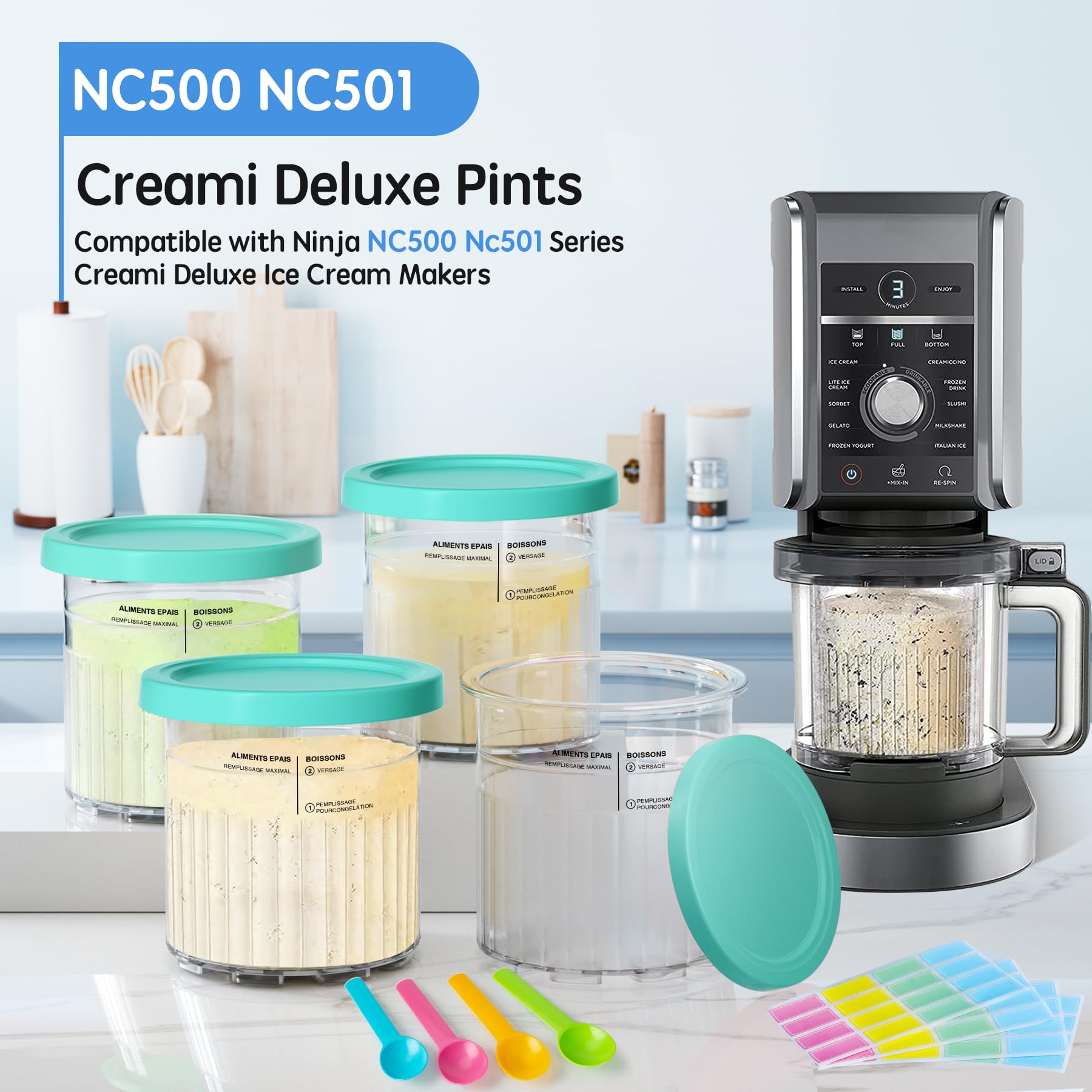 PERFECT FIT MODEL: Compatible with Ninja NC500/NC501 Creami Deluxe 11-in-1 XL Ice Cream Makers. 24 OZ transparent pints with 4 blue lids - perfect for creating multiple ice cream varieties simultaneously, while making different flavors of ice cream for family & friends.