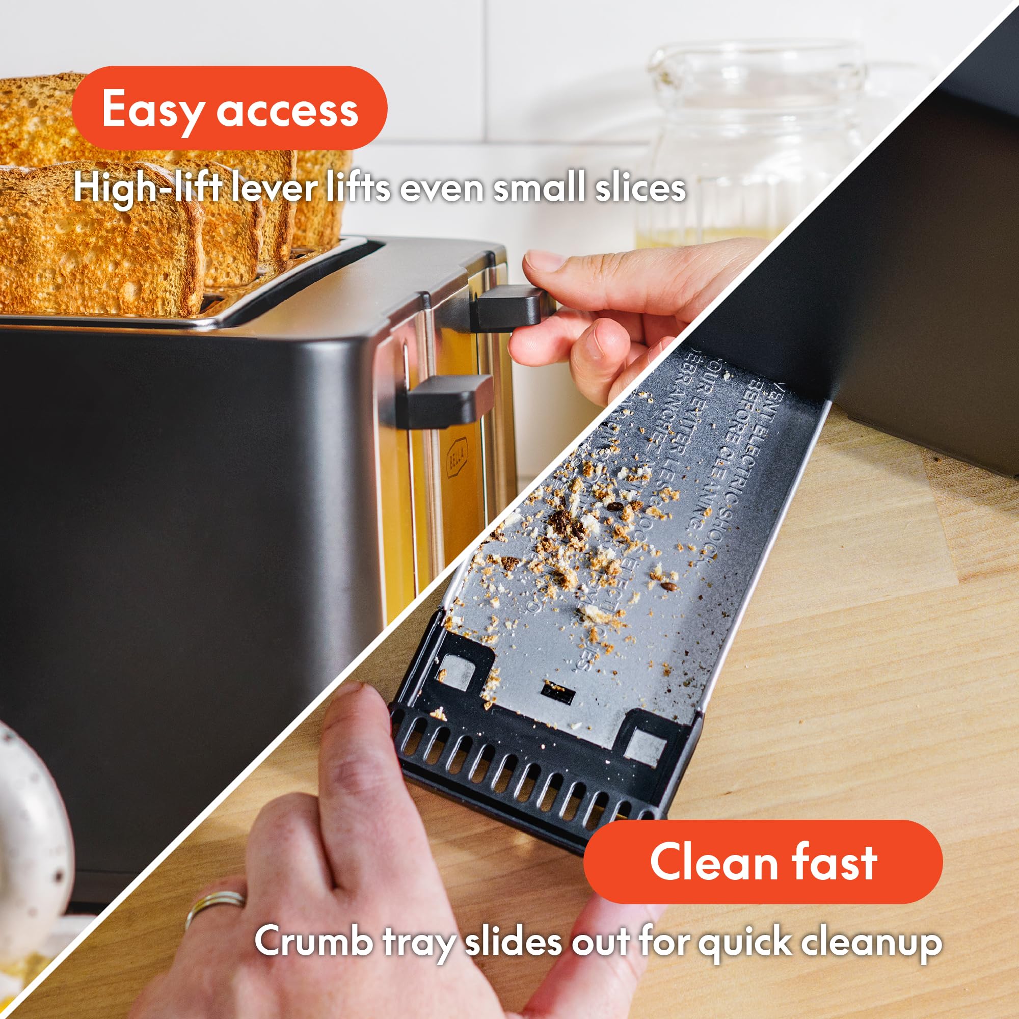 CLEAN WITH EASE: The high lift lever of the portable toaster provides easier access to smaller breads such as English muffins, and the removable crumb tray ensures mess-free cleanup. Safety features like auto shut off and anti-jam make your mornings worry-free