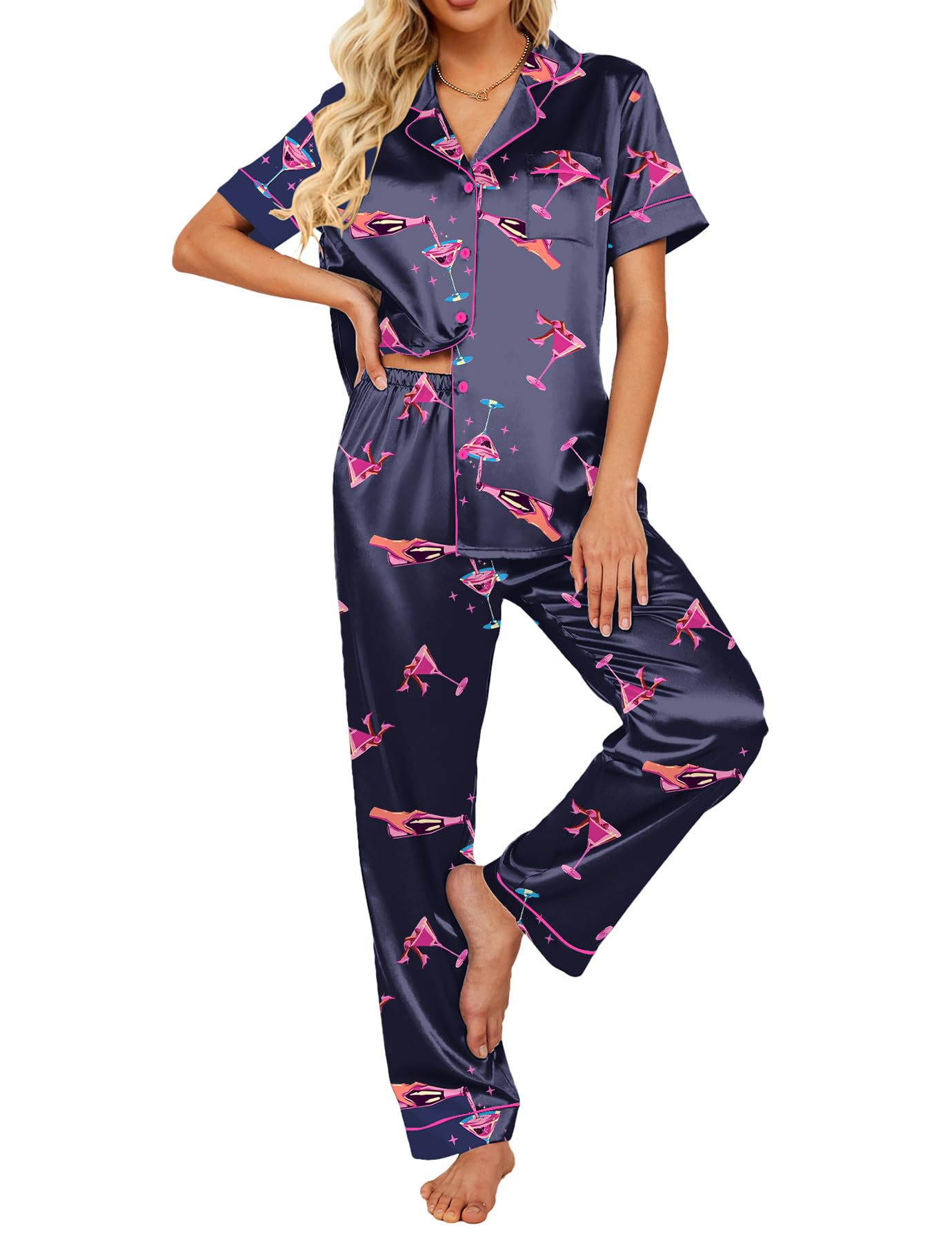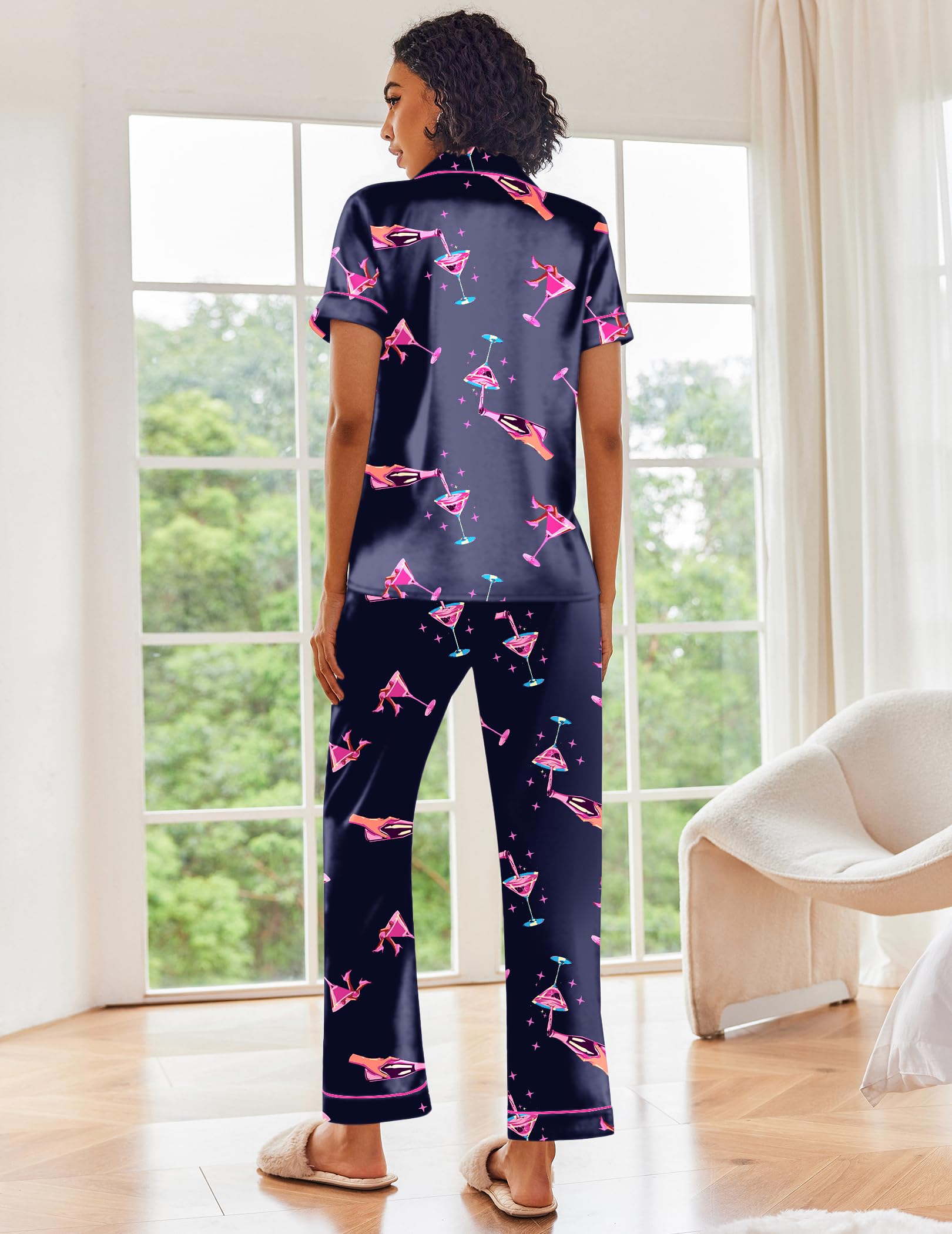 Soft Satin Pajama Set: Made of premium 95% Polyester, 5% Spandex silk satin, the pajama set for women is lightweight, breathable and skin-friendly, just like wrapped in a cloud, helping you have a sound sleep