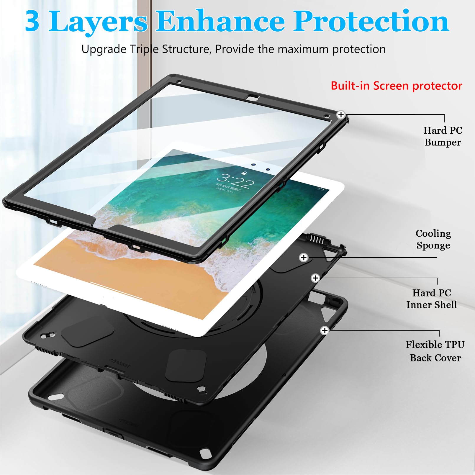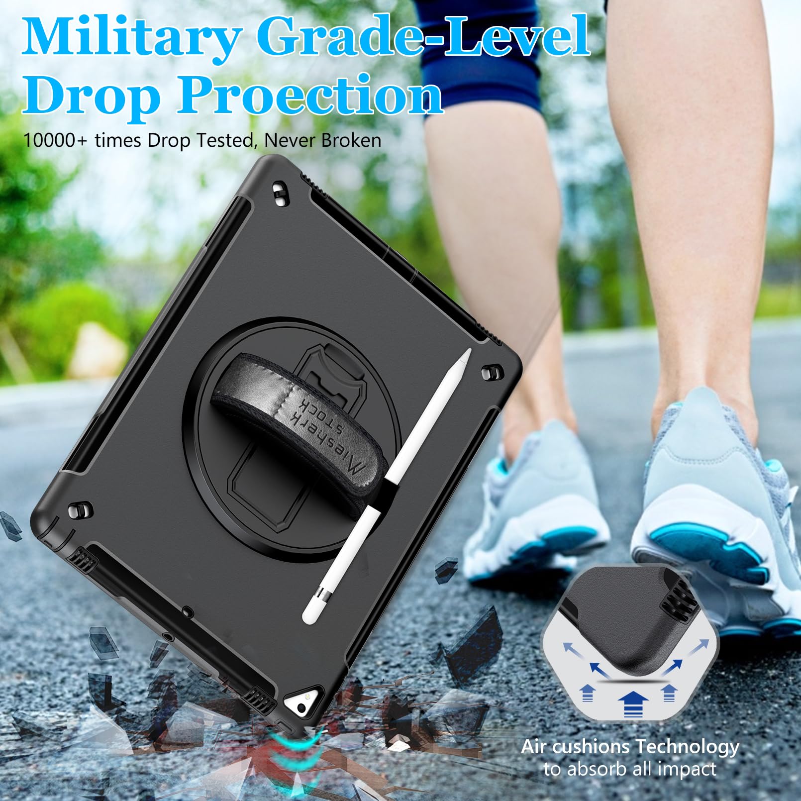 MATERIAL COMPOSITION: This iPad Pro 12.9 case 2017/2015 has a built-in screen protector. The inner cover are Made from Hard PC and outer layer Fexible TPU. Our triple defense system has passed the Military Grade Drop Test [MIL-STD 810G-516.6] and can withstand shocks and drops from up to 15 feet, 10,000 times. These shock-absorbent layers incorporate Air Cushion Technology to effectively protect your iPad Air 11 2024 from accidental drops, bumps, and scratches