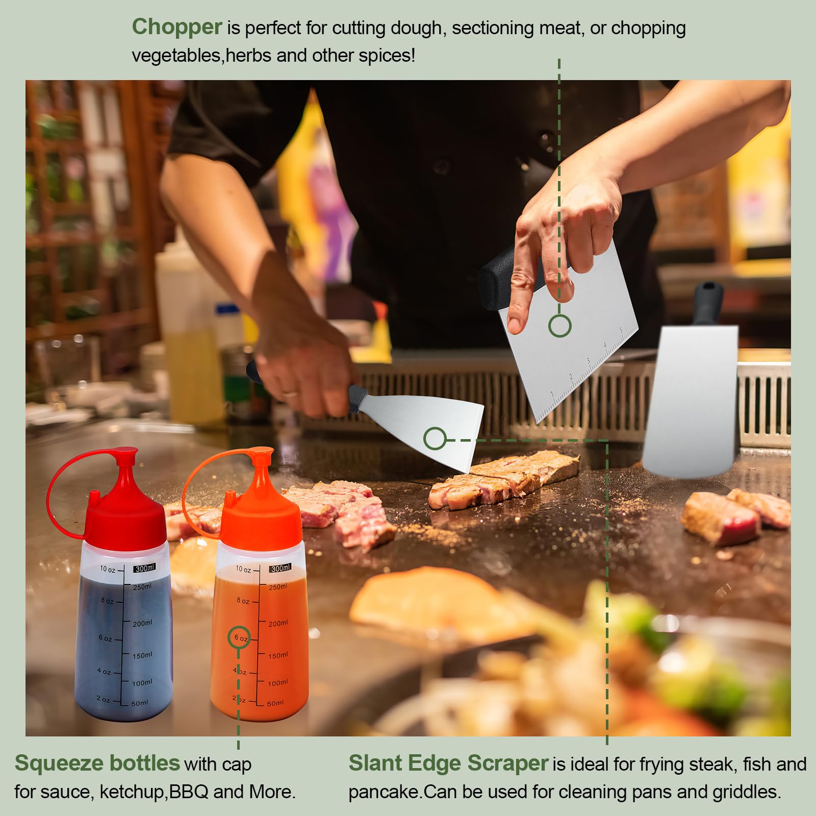 【Chef's Choice griddle accessories kit】This grill tools set with griddle scraper, spatulas and oil bottles helps you to grill as easily as a restaurant chef. Great for flipping burgers, pancakes, veggies, cutting bread,meat and sausage, scraper & chopper to dice food and scrape griddles clean. The Long Griddle Spatula can move large amounts of food quickly and accurately. Egg rings and pepper shakers to enhance your griddle cooking experience.