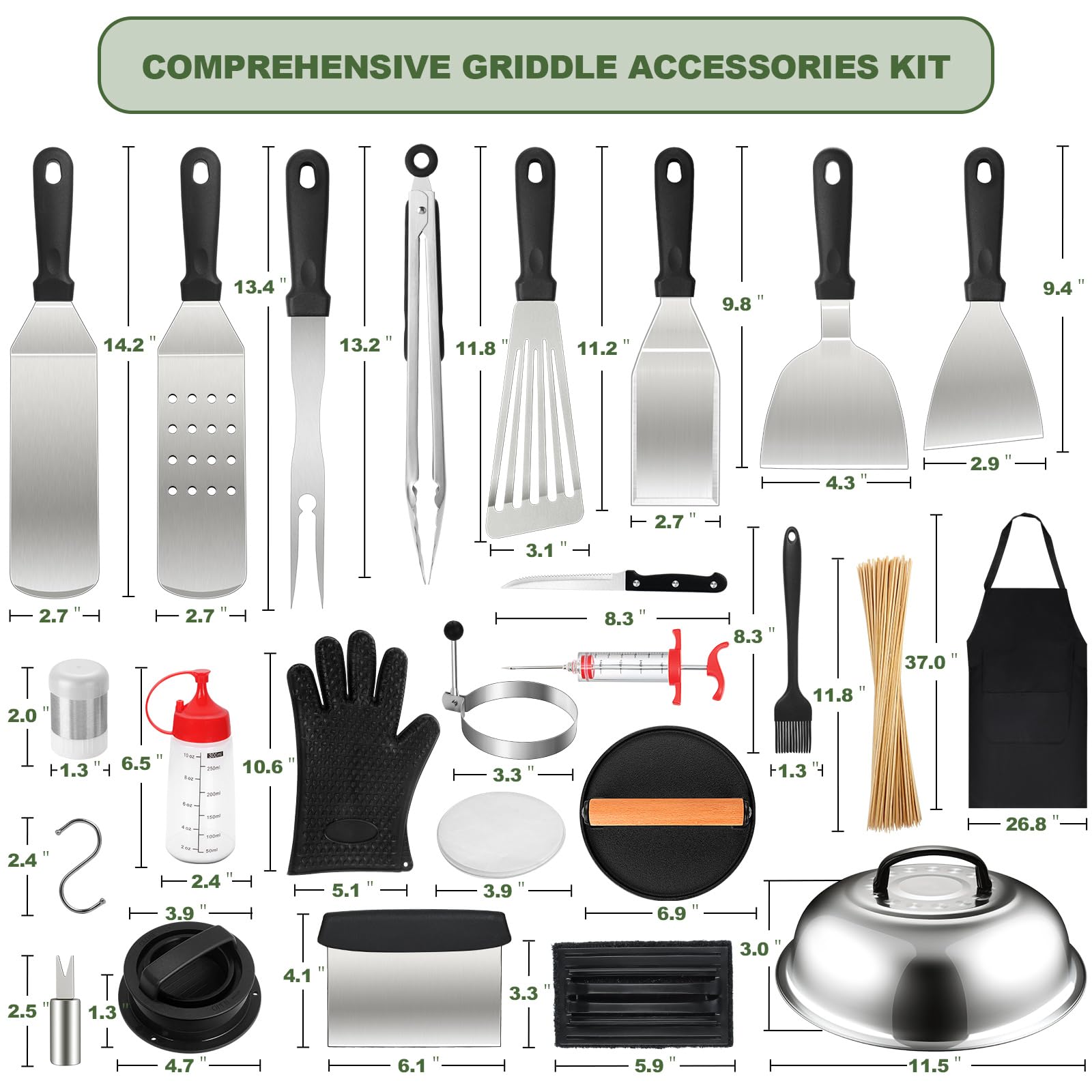 【Perfect 237pcs BBQ Accessories】This kit includes: long griddle spatula, short griddle spatula, slotted spatula, slant edge scraper, basting cover, griddle flipper, burger press, apron, silicone gloves, meat injector, fish turner, meat knife, griddle chopper, grill tongs, grill fork, sauce brush, 2 squeeze bottles, 2 egg rings, 2 spice shakers, 2 corn holders, 10 hanging hooks, 100pcs bamboo skewers, burger patty maker, 100 parchment paper, cleaning brush, storage bag and a package box.