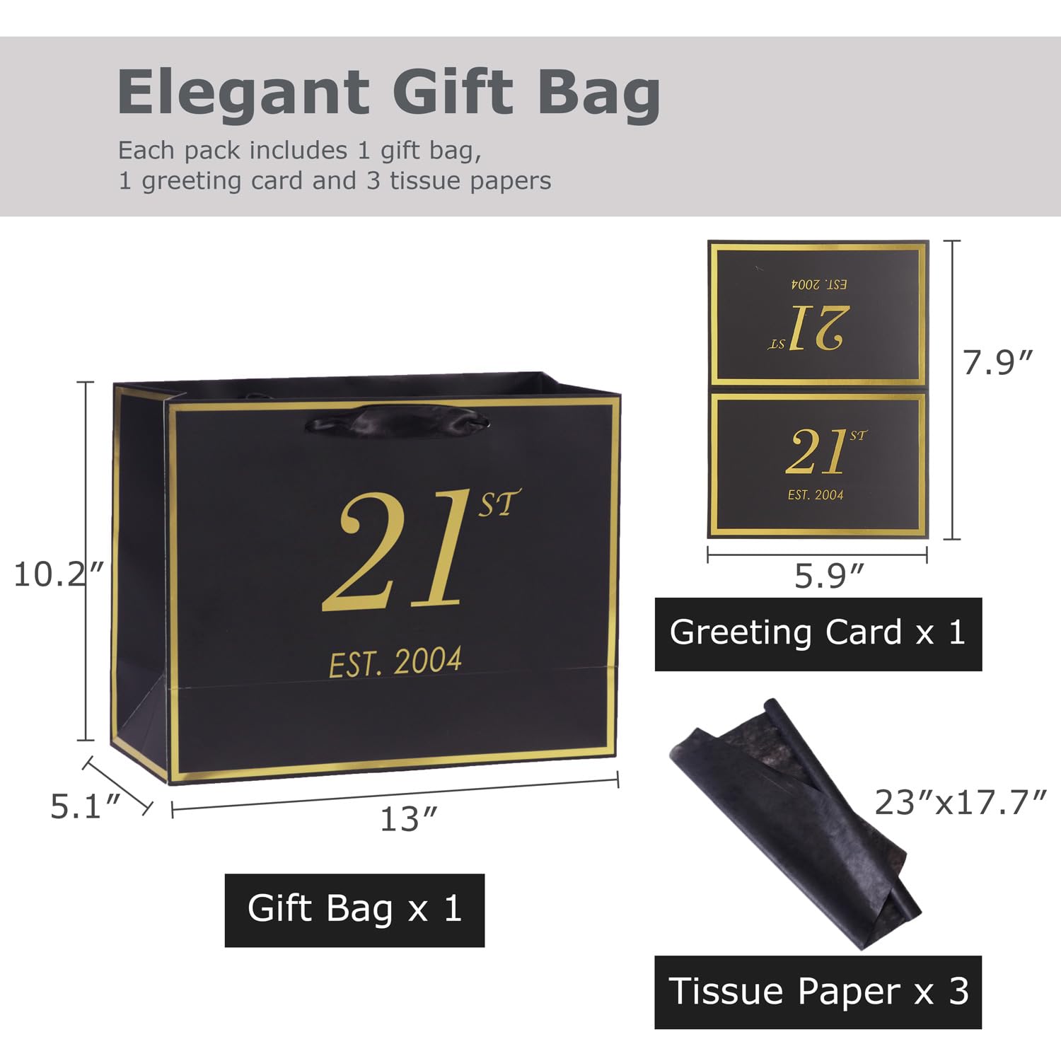 Personalized 21st Birthday Gift Bag: Each gift bag comes with 1 matching greeting card and 3 tissue papers.. The gift bag measures 13" length × 10.2" height × 5.2" width, the greeting card measures 7.9" length × 5.9" width, and the tissue paper measures 23.6" length × 17.7" width, providing a stylish presentation for your gifts.