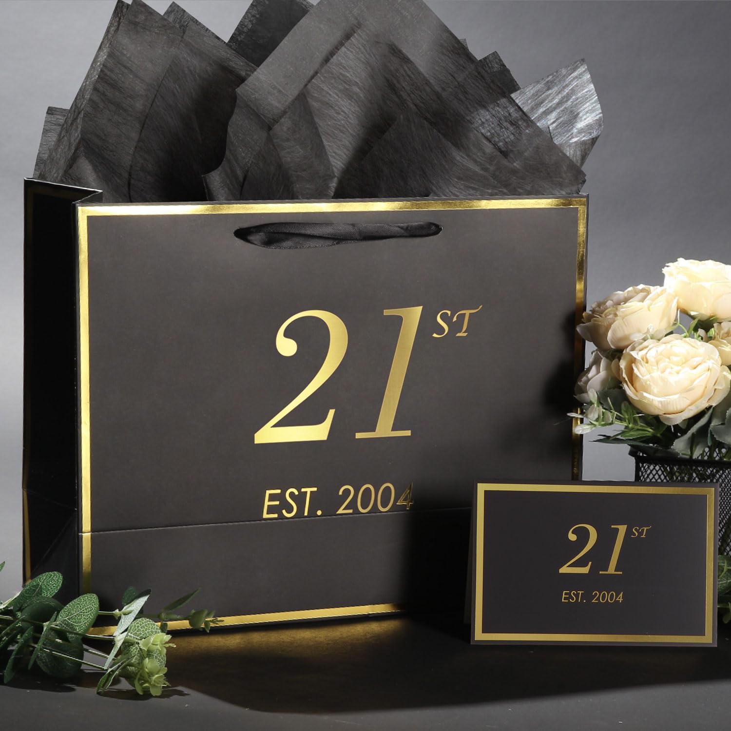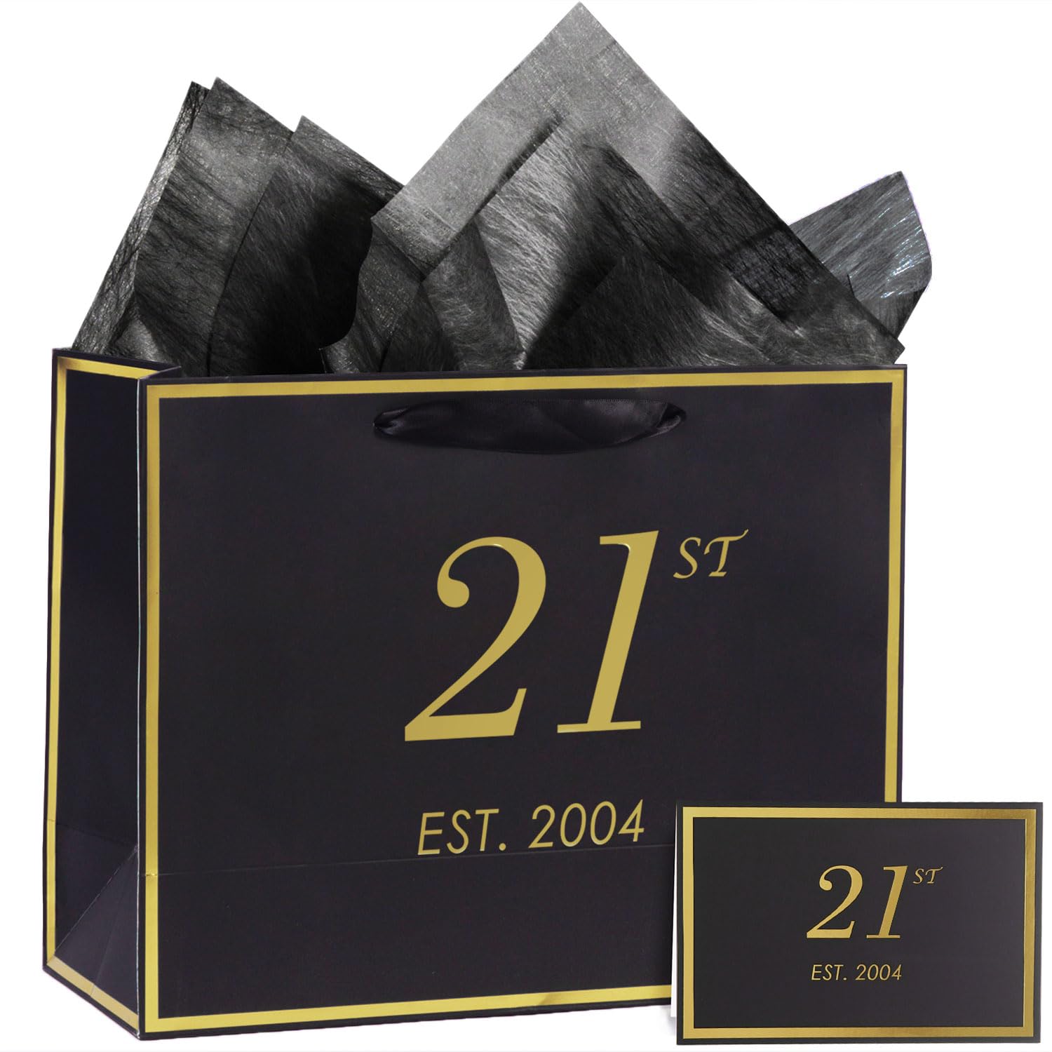 21st Birthday Gift Bag with Card and Tissue Paper for Men Women, 2004 21 Year Old 13" Elegant Black Gold Anniversary Keepsake Party Present Shopping Paper Bags for Gifts Wrapping (2004 21st)