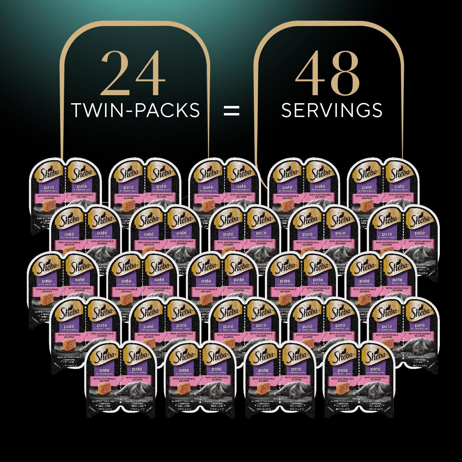 Cats know what they want, the delicious taste of Sheba Perfect Portions Pate. This wet cat food Sheba recipe is made with sustainable salmon for a protein-rich meal that supports daily feeding for pet owners who value a healthy diet. Each savory pate cat food tray contains tender salmon, and Sheba Perfect Portions Wet Cat Food offers built-in portion control, giving cat parents a convenient, mess-free way to serve fresh meals. With added moisture to keep your cat hydrated, this grain-free pet food contains no fillers and no artificial flavors, although trace amounts may be present due to cross-contact during manufacturing. Perfect for picky eaters, this cat wet food pate contains healthy fats and is made with essential amino acids. We believe that truly irresistible cat food comes not just from expert preparation but from select ingredients sourced with care. The Sheba brand is committed to responsibly sourced fish in its recipes. Visit sheba.com/sustainability for details.