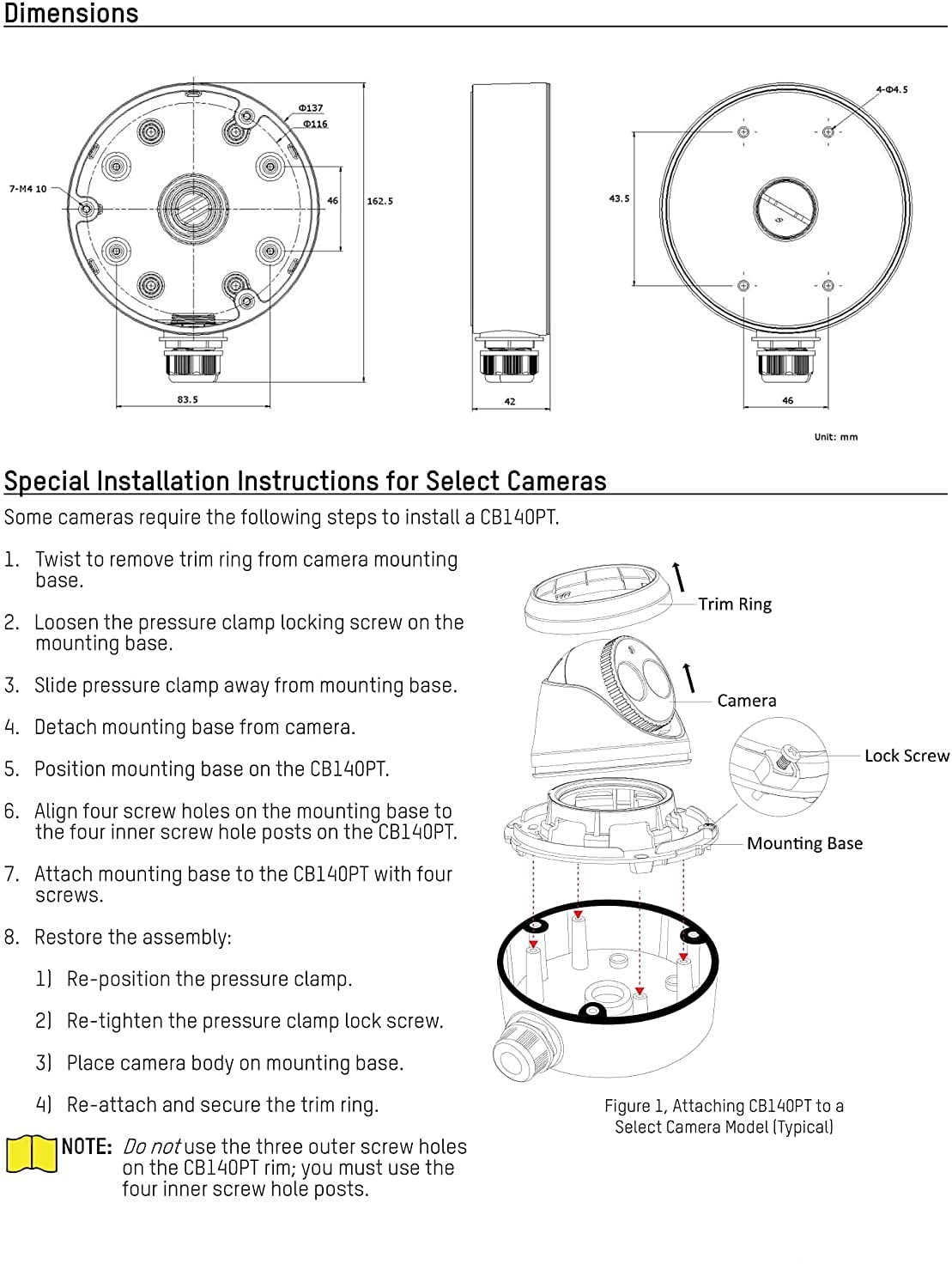 DS-1280ZJ-DM21 Wall Mount Bracket for DS-2CD2358G1-I and DS-2CD2347G1-LU. The bracket should be installed on a flat wall. The wall must be capable of supporting a minimum of three times the total weight of the camera and mount. The maximum load capacity of the bracket is 9.92 lbs (4.5 kg).