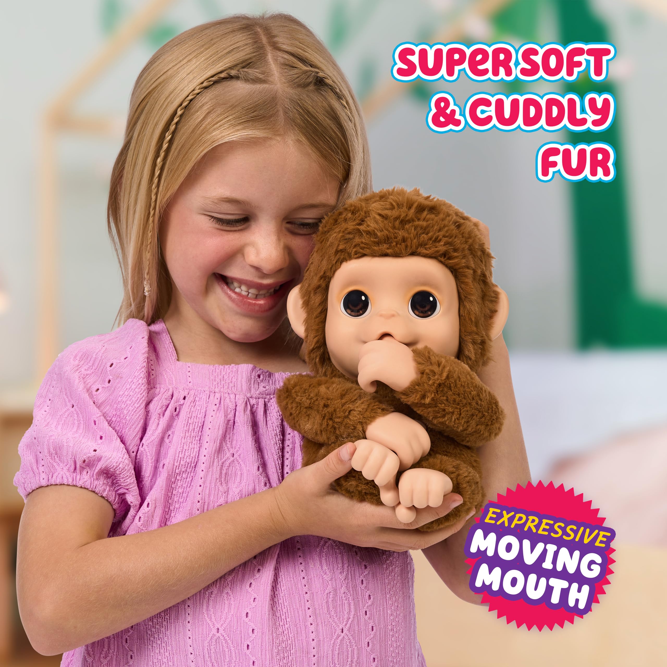 Little Live Pets Baby Monkey : Mango the interactive toy monkey plush is the cutest, most fun baby animal anyone could have! With over 50 sounds and reactions, interactive animal toys like this act just like a real baby monkey. Watch over this kids monkey toy as it sucks its thumb, feeds from the bottle, giggles when tickled, and hums a lullaby when itβs sleepy. Whether hanging upside down or snuggling in your childβs arms, Mango the playful monkey is always full of surprises. These cuddly monkey plushies feature soft, huggable fur and realistic details like big monkey ears and gripping hands and feet that let him hang from branches, beds, or even your childβs arm! Kids will love bonding with monkey baby toy and caring for him like a real pet. Included in the talking monkey soft toy box are 3 x AA batteries, a bottle accessory, instruction booklet, and an adoption certificate children can sign to promise theyβll always look after their new best friend. The packaging even transforms into a high chair playset for feeding and imaginative play! Perfect for ages 4+, this stuffed monkey plush makes a delightful gift for kids who love animals and pretend play.