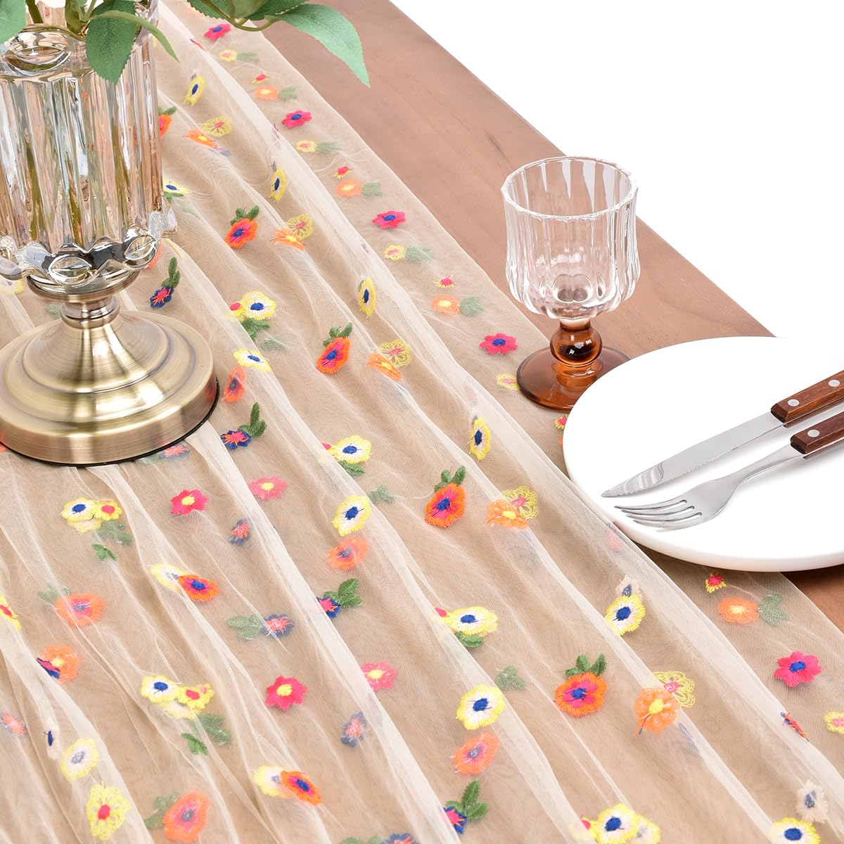 Joanlody Champagne Embroidery Daisy Fall Thanksgiving Table Runner 10ft Florals Seasonal Tulle Table Runner Holiday Kitchen Dining Table Decoration for Home Party Indoor