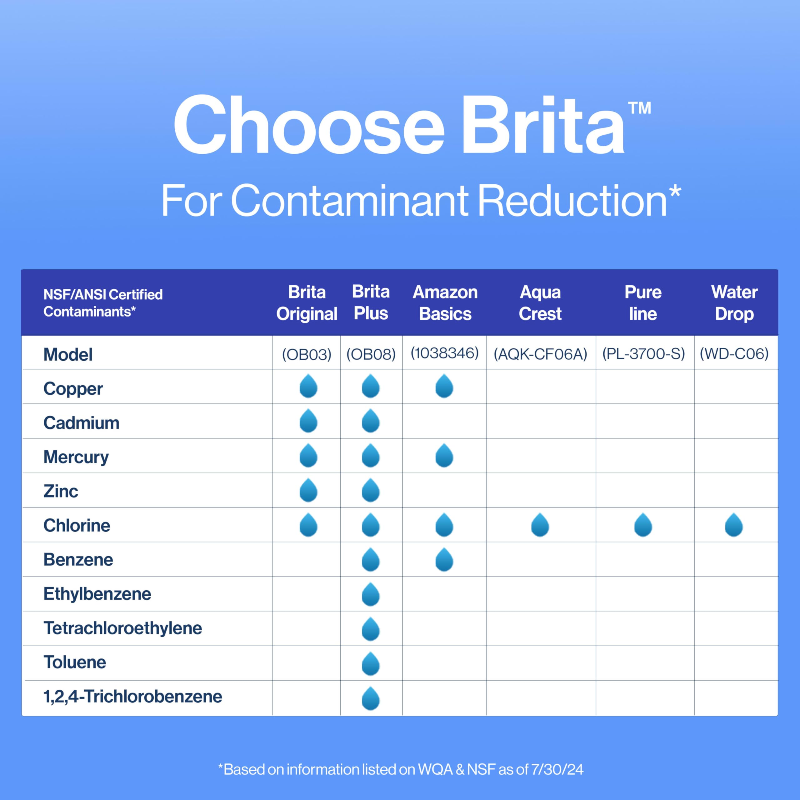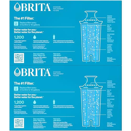Drink healthier, great-tasting tap water with the Brita Standard Water Filter. This BPA-free Brita water filter cuts the taste and odor of chlorine, plus it reduces copper, cadmium and mercury impurities using ion-exchange resin and activated carbon. Built-in mesh screens on this replacement water filter prevent black flecks in your water filter pitcher, leaving you with great-tasting, clear drinking water. You can replace up to 1,800 standard 16.9-oz. plastic water bottles a year with Brita, so you can stay hydrated, save money and reduce plastic waste. With no presoak required, these Brita filters are quick and easy to install in a Brita filter water pitcher or dispenser. One water filter replacement lasts up to two months or 40 gallons. Brita Standard Water Filters fit in all Brita systemsexcept Brita Streamincluding Brita water filtration pitcher and dispenser models. Get great taste, less waste and more savings from Brita.