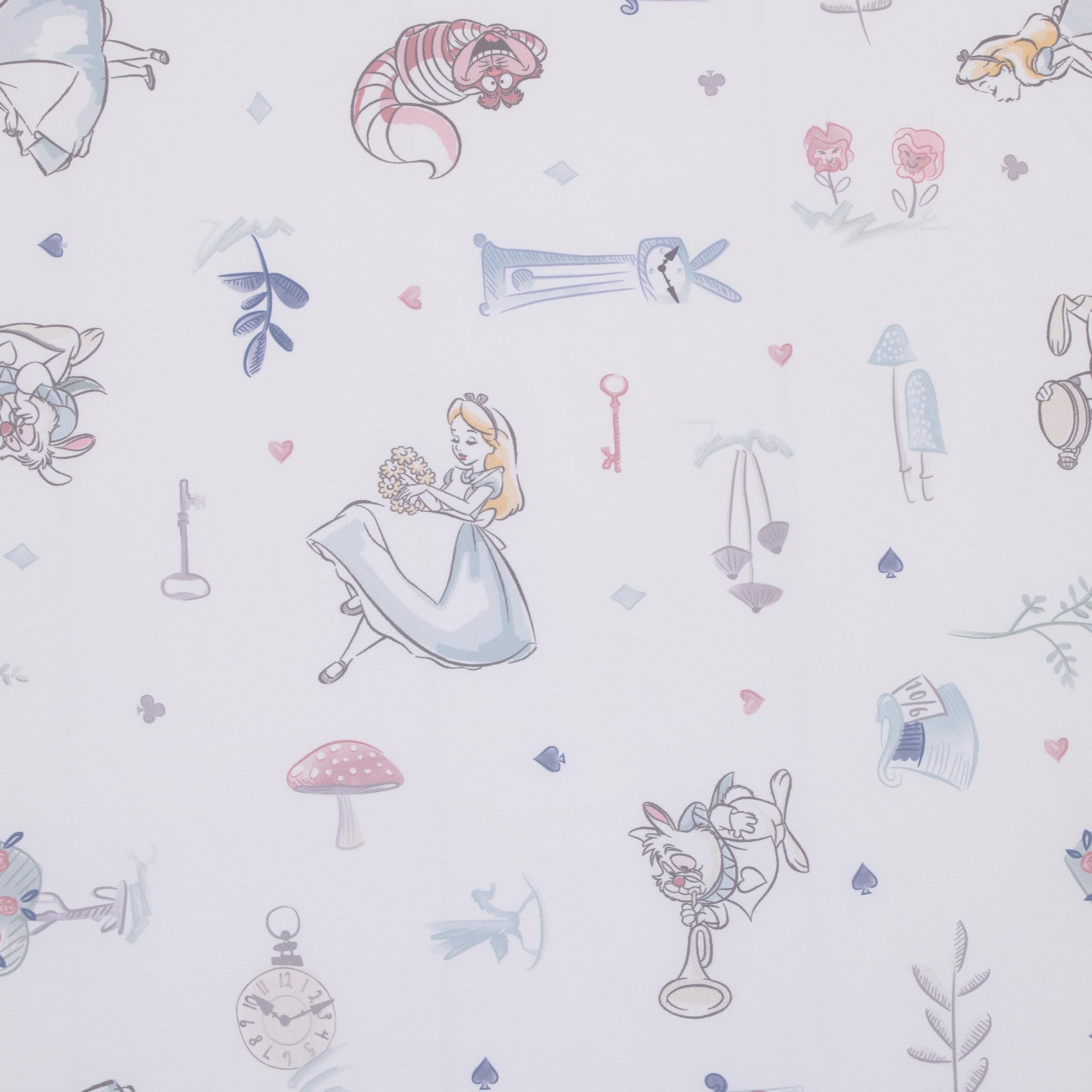 The Disney Alice in Wonderland Fitted Crib Sheet features a whimsical allover pattern with Alice, the White Rabbit and Cheshire Cat! Beautifully designed in lovely shades of light blue, pink, yellow, and white, with the Mad Hatters Hat, mushrooms, clocks, keys, and the Cheshire Cat smiling from ear to ear! Your little one will sleep soundly on this crib sheet's cozy surface. Measures 28" x 52" x 8" and includes full elastic edges for a safe and snug fit and fits a standard size crib/toddler mattress. Coordinates nicely with most decor and perfect for your Alice in Wonderland nursery!