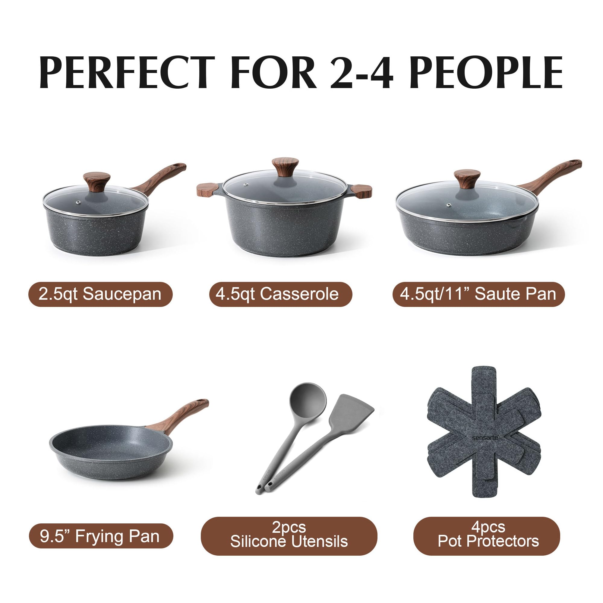 Large & Versatile 13-piece Cooking Set - Includes 9.5-inch fry pan, 4.5QT/11-inch sauté pan with lid, 2.5-quart saucepan with lid, and 4.5-quart casserole pan with lid. Meets all your daily cooking need and give you the interest back to cook.