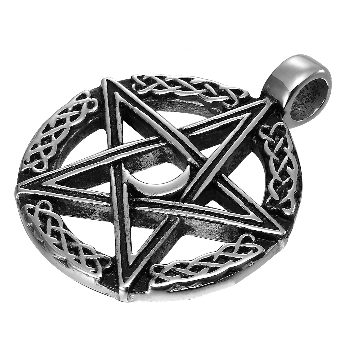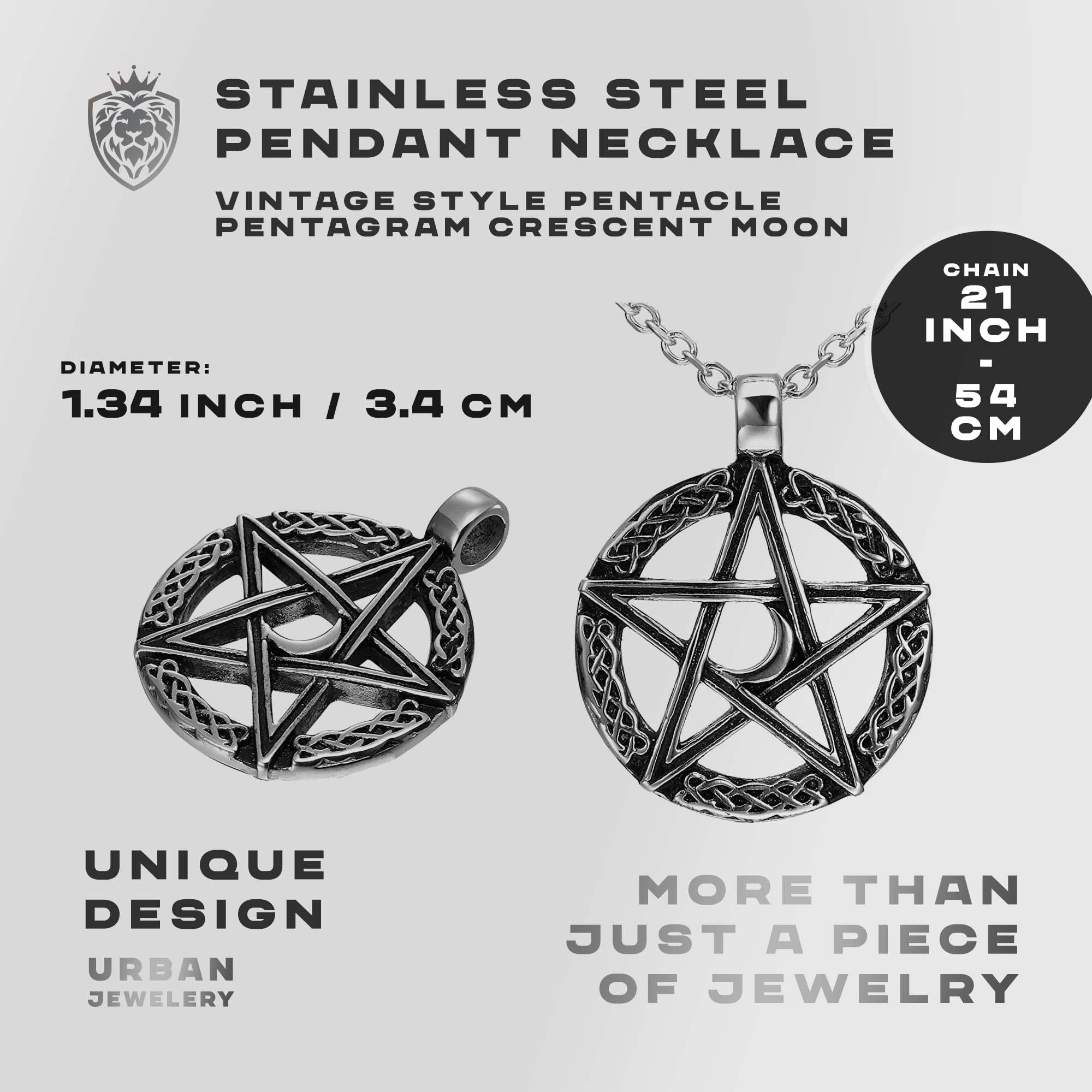 Description Getting the look of an aged heirloom pentagram necklace doesn't have to mean spending a fortune for an antique! The Urban Jewelry Vintage Style Pentacle Pentagram Crescent Moon Stainless Steel Pendant Necklace for Men looks like a necklace that has been handed down through the ages but is brand new and made from the finest quality non tarnishing stainless steel. Measuring 1.34 inches in diameter by 1.5 inch in thickness, the Urban Jewelry Vintage Style Pentacle Pentagram Crescent Moon Stainless Steel Pendant Necklace for Men presents two important symbols from many religious faiths. The crescent moon in the center has long been revered as a symbol of the harvest and is symbolic over the triumph over death in the Islamic faith. The pentagram is the embodiment of all five elements: earth, wind, water, fire and ether, which represents the spirit. Sold with a 21-inch stainless steel chain, the Urban Jewelry Vintage Style Pentacle Pentagram Crescent Moon Stainless Steel Pendant Necklace for Men arrives ready to wear in a stylish gift box. The necklace makes a very unique gift of faith for men for any occasion. Treat yourself or a special gentleman to the beauty of a vintage inspired necklace! Order the Urban Jewelry Vintage Style Pentacle Pentagram Crescent Moon Stainless Steel Pendant Necklace for Men today.