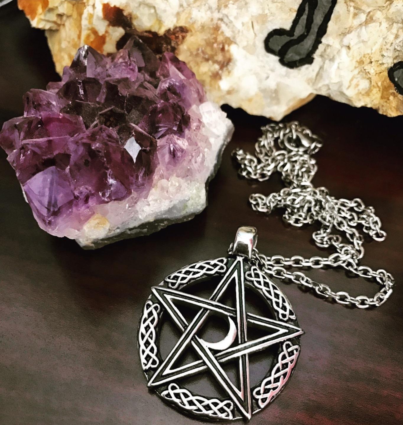 UNIQUE DESIGN: TWO BEAUTIFUL SYMBOLS This necklace combines the symbol of the goddess' aging and the triumph over death in the Muslim faith, while the pentagram symbolizes the five elements of nature. This is a truly unique piece that is stylish and has meaning and is one of our most popular necklaces. It is easily interchangeable from day to night and will get you noticed wherever you go!
