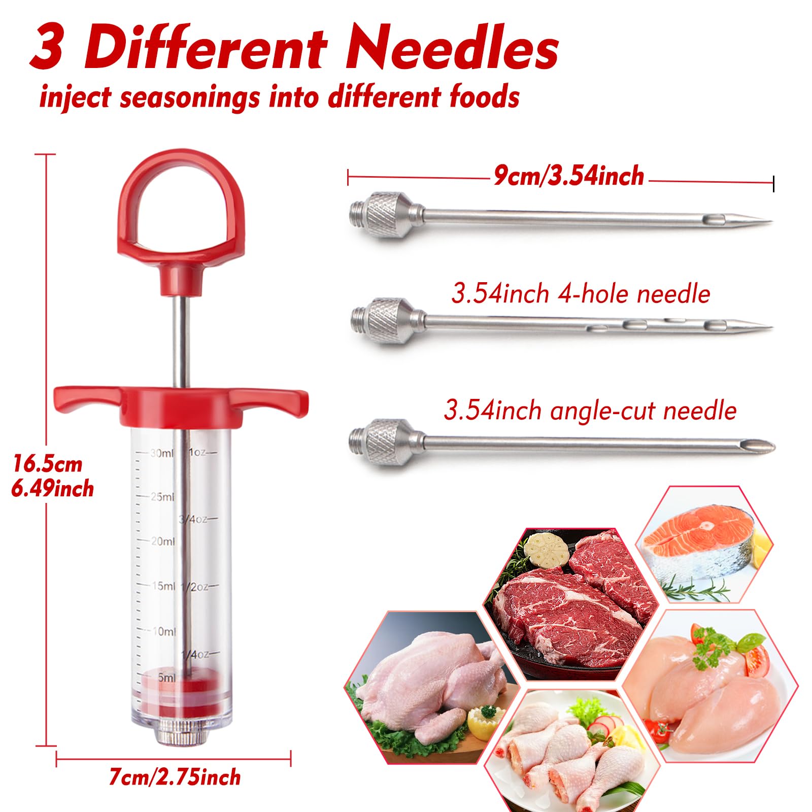 Easy to Use--ergonomically designed for injecting handles; graduated injection chamber: 1-oz/30ml capacity measurement markings in ml and oz up the side; 3” seasoning injector needle with hole for deep penetration and sauce distribution with liquid brine/marinades