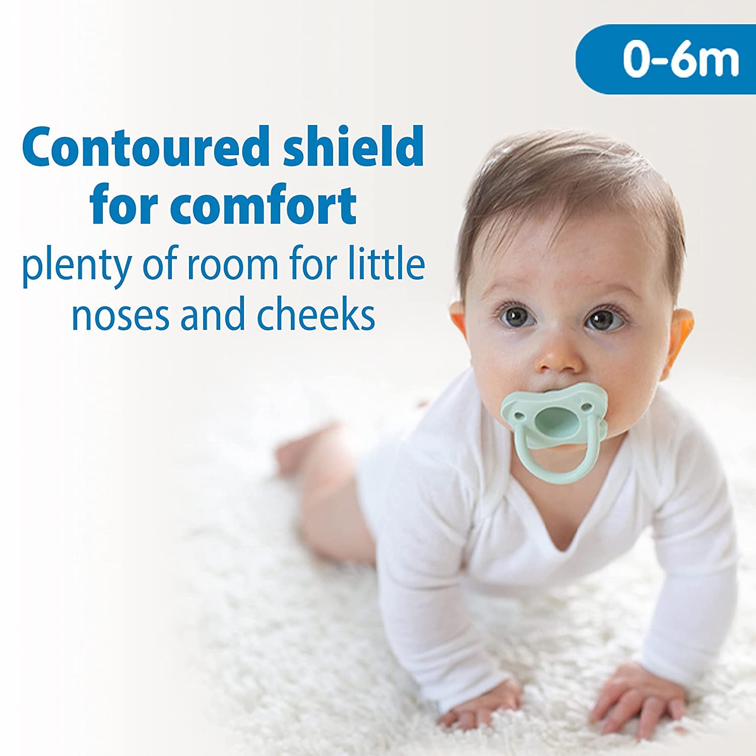 CONTOURED COMFORTABLE SHIELD. The one-piece construction of the HappyPaci features a contoured butterfly-shaped shield for comfort. The shield curves away from baby’s face, providing plenty of room for little noses and cheeks.