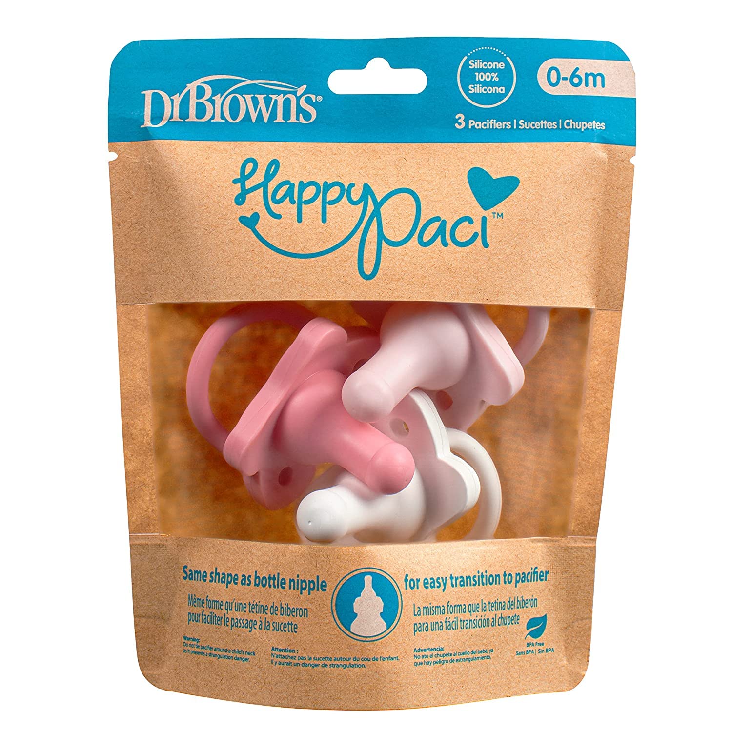 Contains (6) Dr. Brown's HappyPaci 100% Silicone, Newborn Baby Pacifiers 0-6 Months, BPA Free (1) White (1) Light Pink (1) Pink (1) Cool Gray (1) Green (1) Ecru