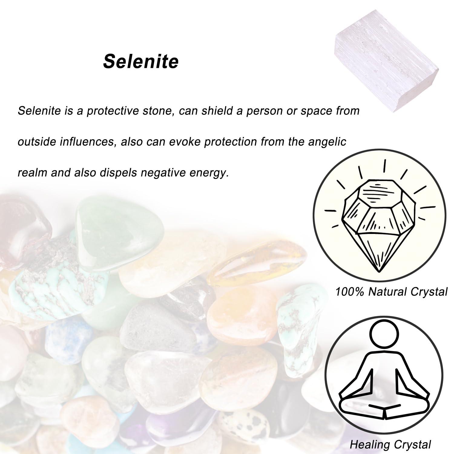 Natural: You will receive 1pcs authentic raw Selenite stone.Selenite is a protective stone, can shield a person or space from outside influences, also can evoke protection from the angelic realm and also dispels negative energy