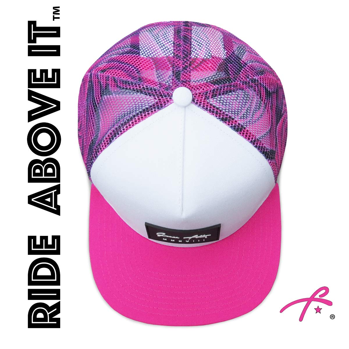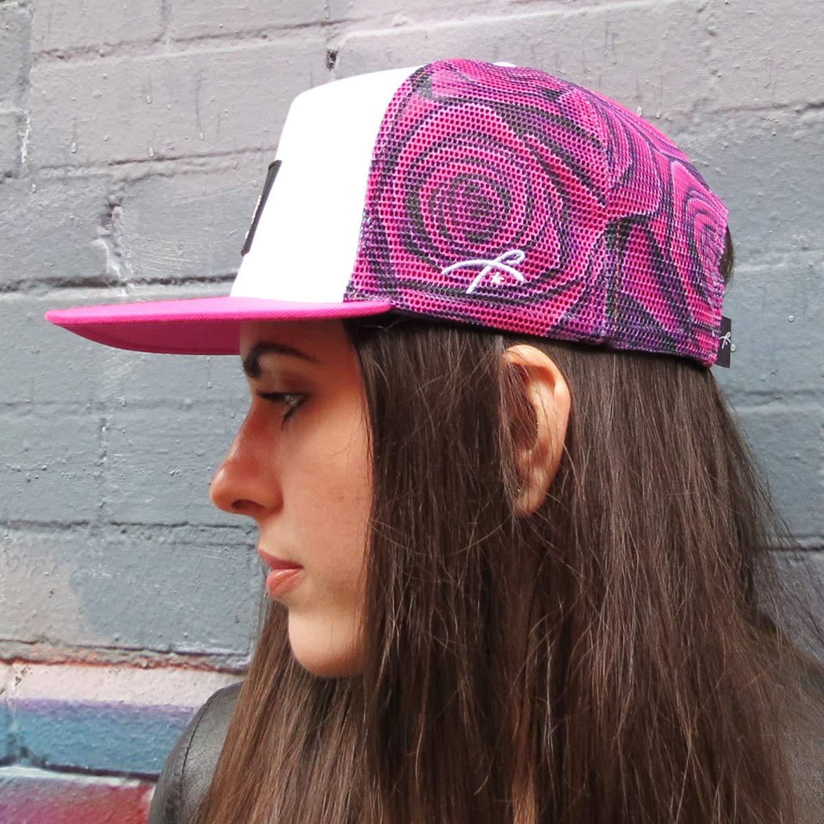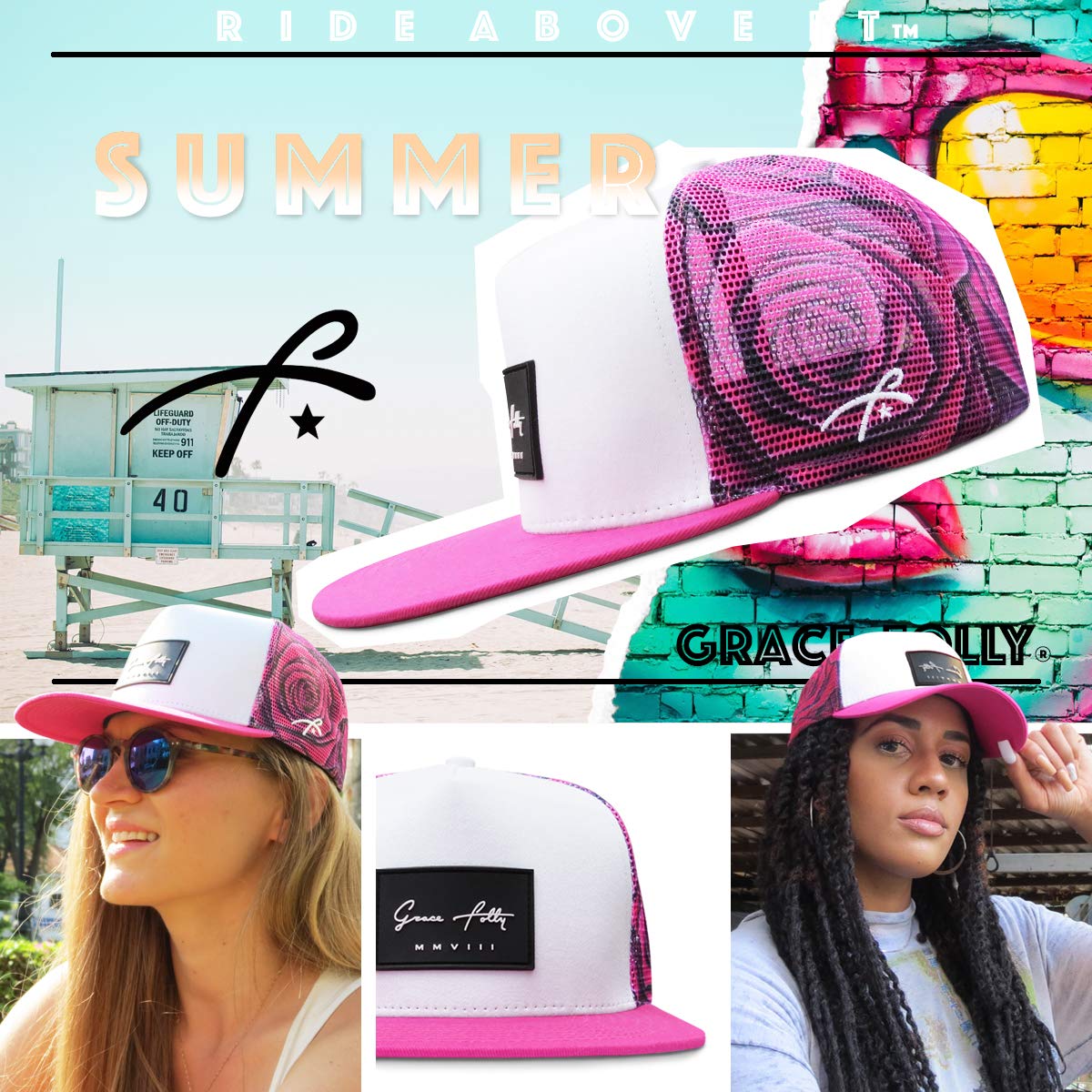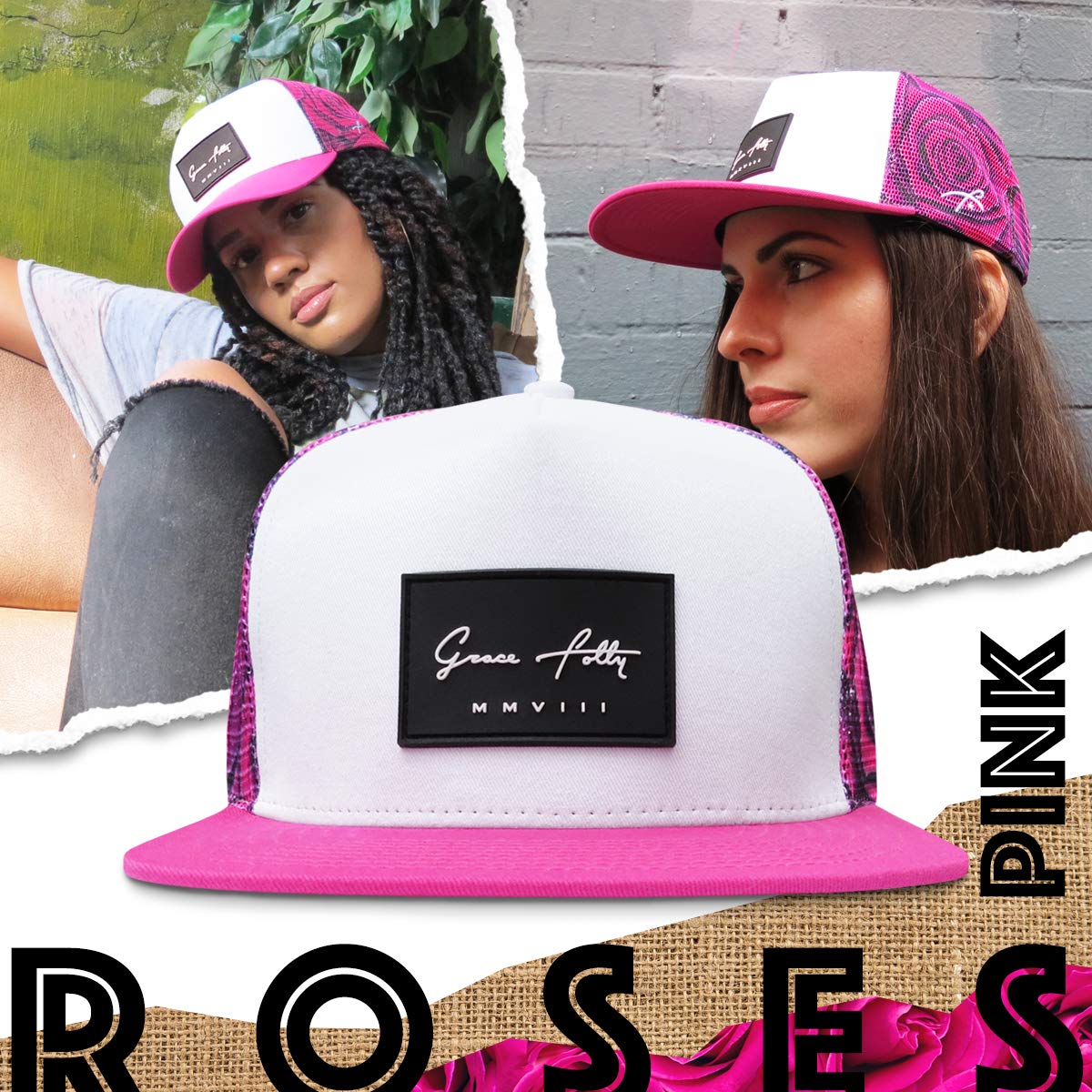 SMOOTH TRUCKER- This Pink Rose Grace Folly flat bill trucker hat is sure to impress! Structured 5 panel trucker cap with mesh back and adjustable snapback. Be the envy of your friends in this old school trucker.