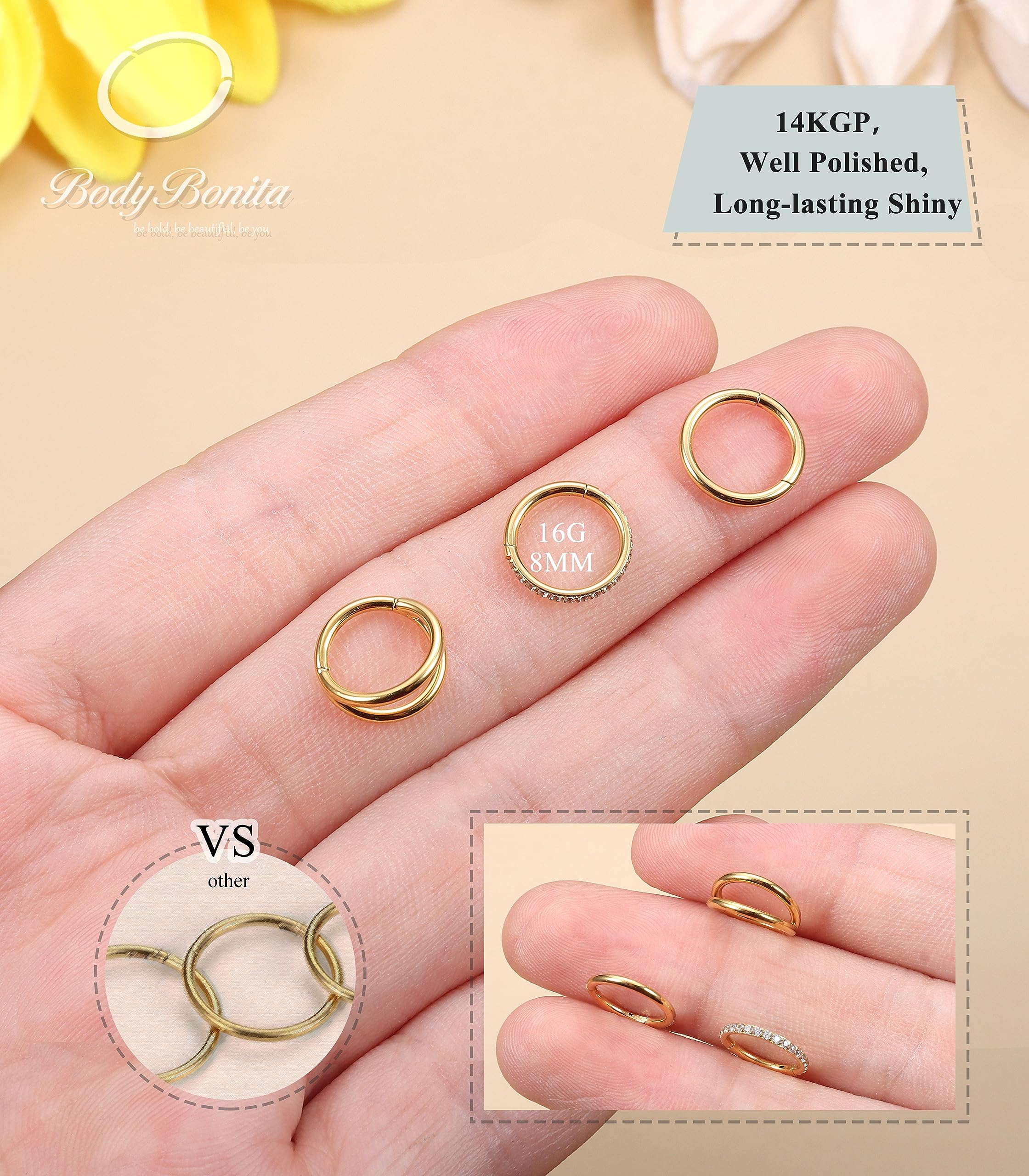 Description What you get: 3 pcs of BodyBonita seamless nose ring(14K gold plated/silver/black plated/rose gold plated ), crafted to be brilliantly shiny, hypoallergenic, and effortlessly easy to put in and take out. Materials: 316L stainless steel. Style in One Package: cubic zirconia nose hoop, double nose ring hoop, classic single nose rings hoop. Available Color: 14K gold plated/silver/black plated/rose gold plated. Avaliable Gauges Size: 14g, 16g, 18g, 20g. Avaliable Inner Diameter : 7mm, 8mm, 9mm, 10mm. Product Types: Lip piercing/aretes para labios, Septum ring, Hoop belly button rings, Cartilage earring, Daith piercing jewelry, Conch hoop earring, Helix earring, Tragus earring, Rook earrings, Acero inocidable dorado arete percing, Nipple rings.