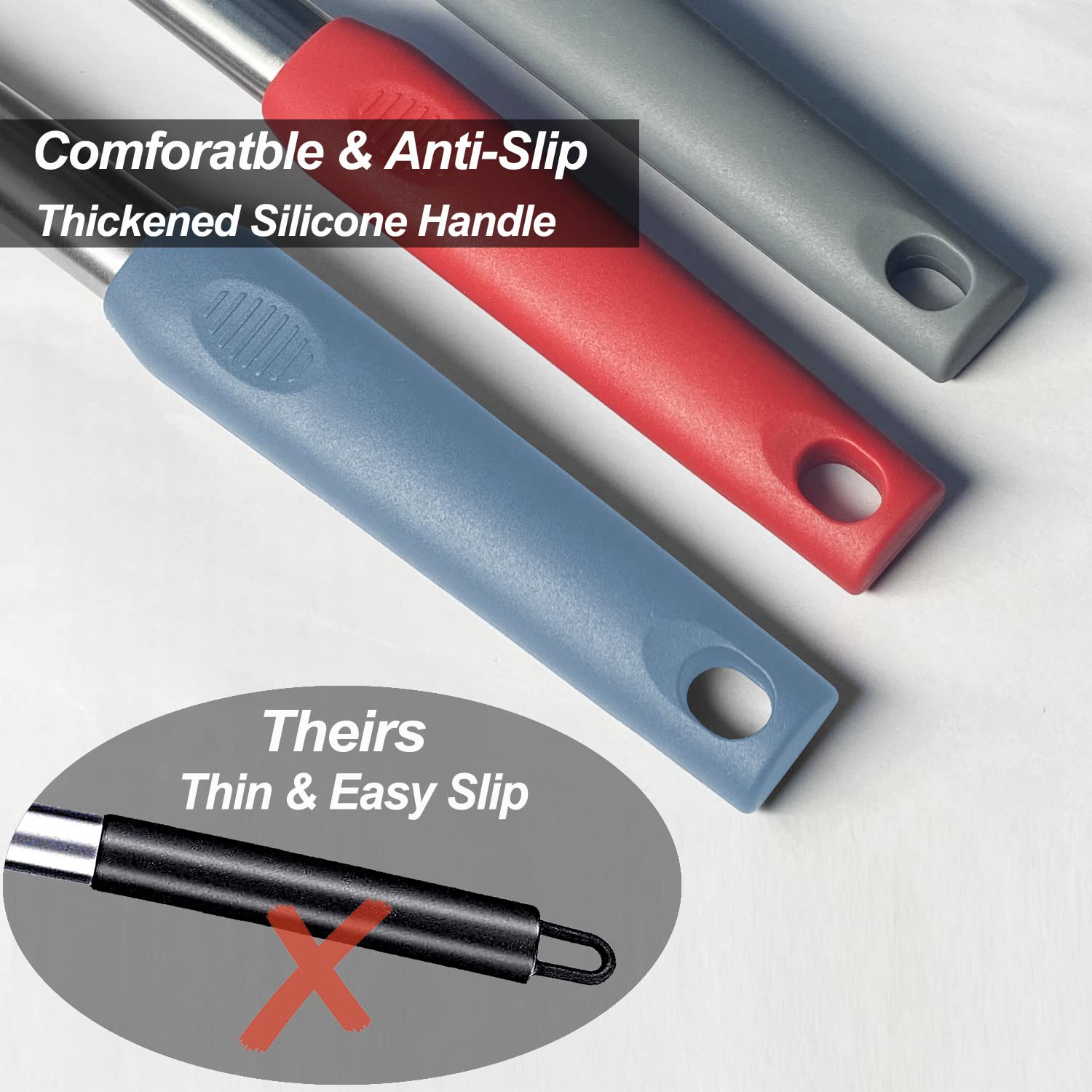 More Comfortable Handle: Unlike other generics, we upgrade the handles; The stainless steel handle core is coated with thicker silicone, it is more durable, and isolate heat better; The profile is ergomonic designed and gives your better grip experience.