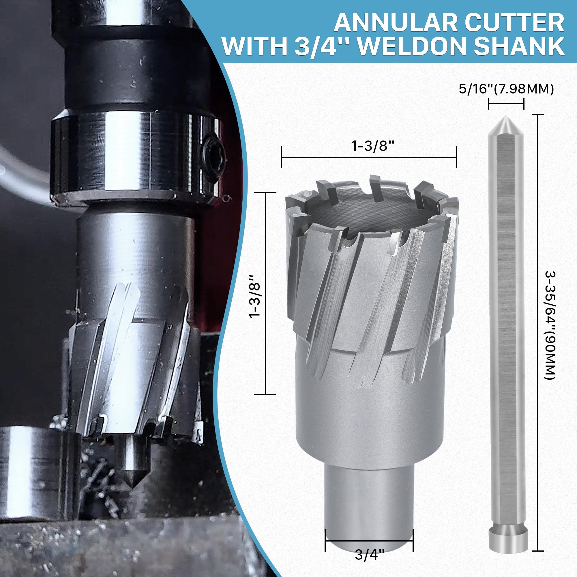 【Specifications】 - KEENTECH Annular Cutter features a premium carbide cutting edge for outstanding durability, making it ideal for drilling harder materials like stainless steel. It offers a 1-3/8"cutting diameter and a 1-3/8"cutting depth, and comes with a free pilot pin. The 3/4" weldon shank design is compatible with various magnetic drills, including but not limited to Alfra, Evolution, Dewalt, Vevor, Zelcan and Hougen.