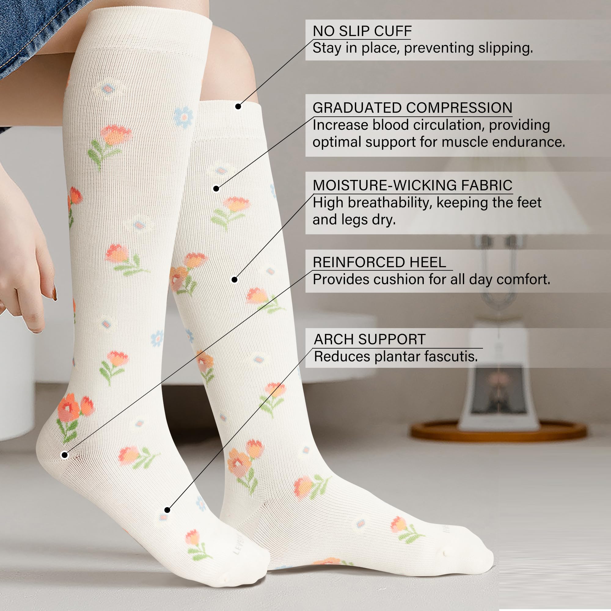 Compression Socks: These cute and fun compression socks offer a comfortable yet snug fit without being too tight, ensuring they stay securely in place. They are easy to put on and take off, providing 360° support for the feet and legs. Womens compression socks are suitable for all seasons, keeping you warm in winter and cool in summer.