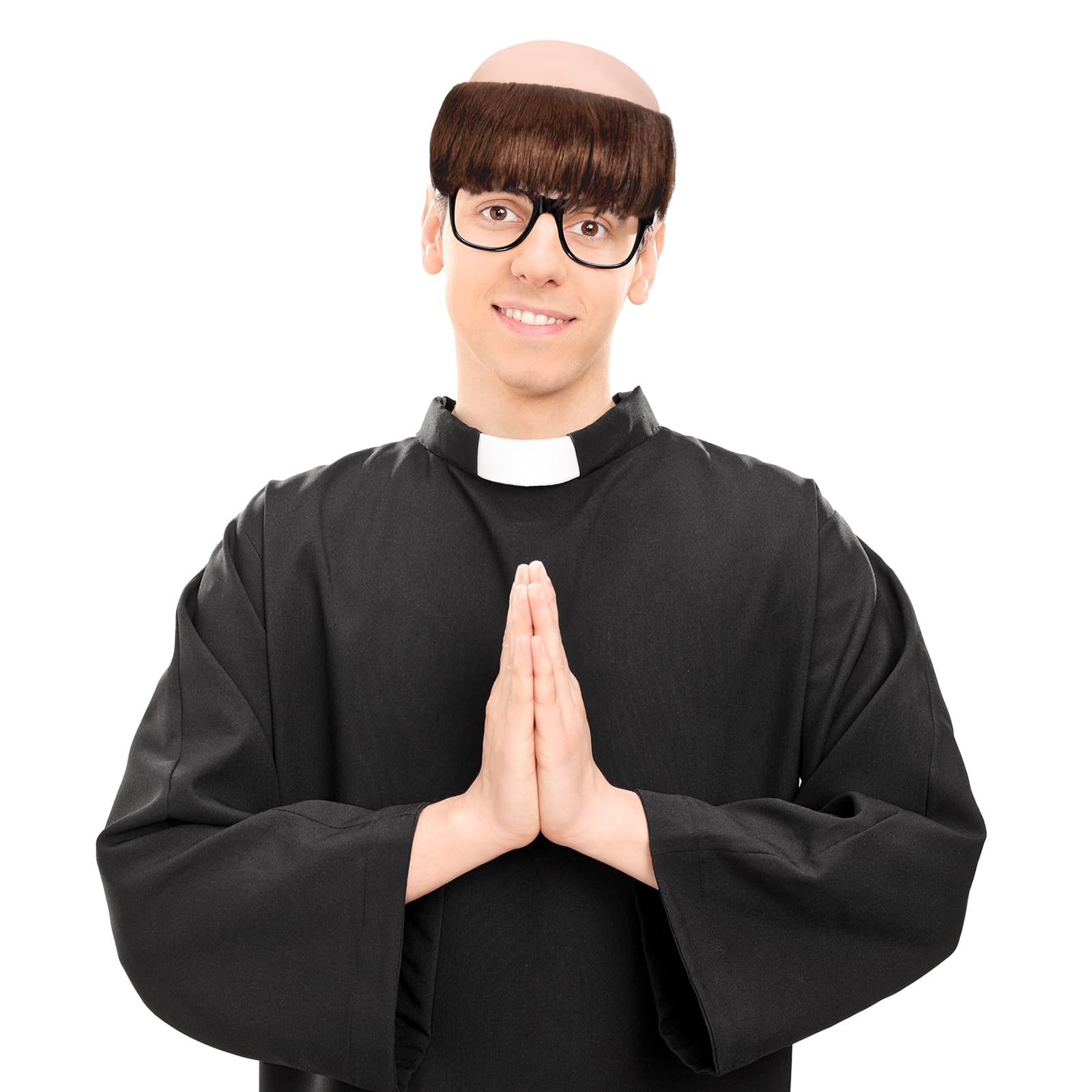 Halloween Cosplay Wig: the brown bald wig is an essential component to complete your monk or friar costume, it melds easily with the brown robe, white belt, and a cross necklace, creating a complete impression