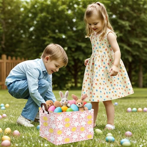 【LARGE CAPACITY AND FASHIONABLE PATTERNS】: The children's Easter basket has a large capacity and can accommodate larger Easter gifts and items. The Easter gift basket is digitally printed with patterns featuring Easter eggs and rabbits as the theme, with bright colors that will not fade.