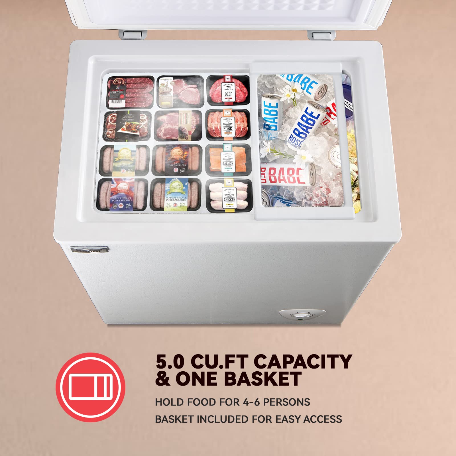 IDEAL FOR YOUR KITCHEN: Deep freezer has a large 5.0 cu.ft capacity, so you do not have to worry about not having room to store more food; With one removable basket, various shapes of food can be combined and stored