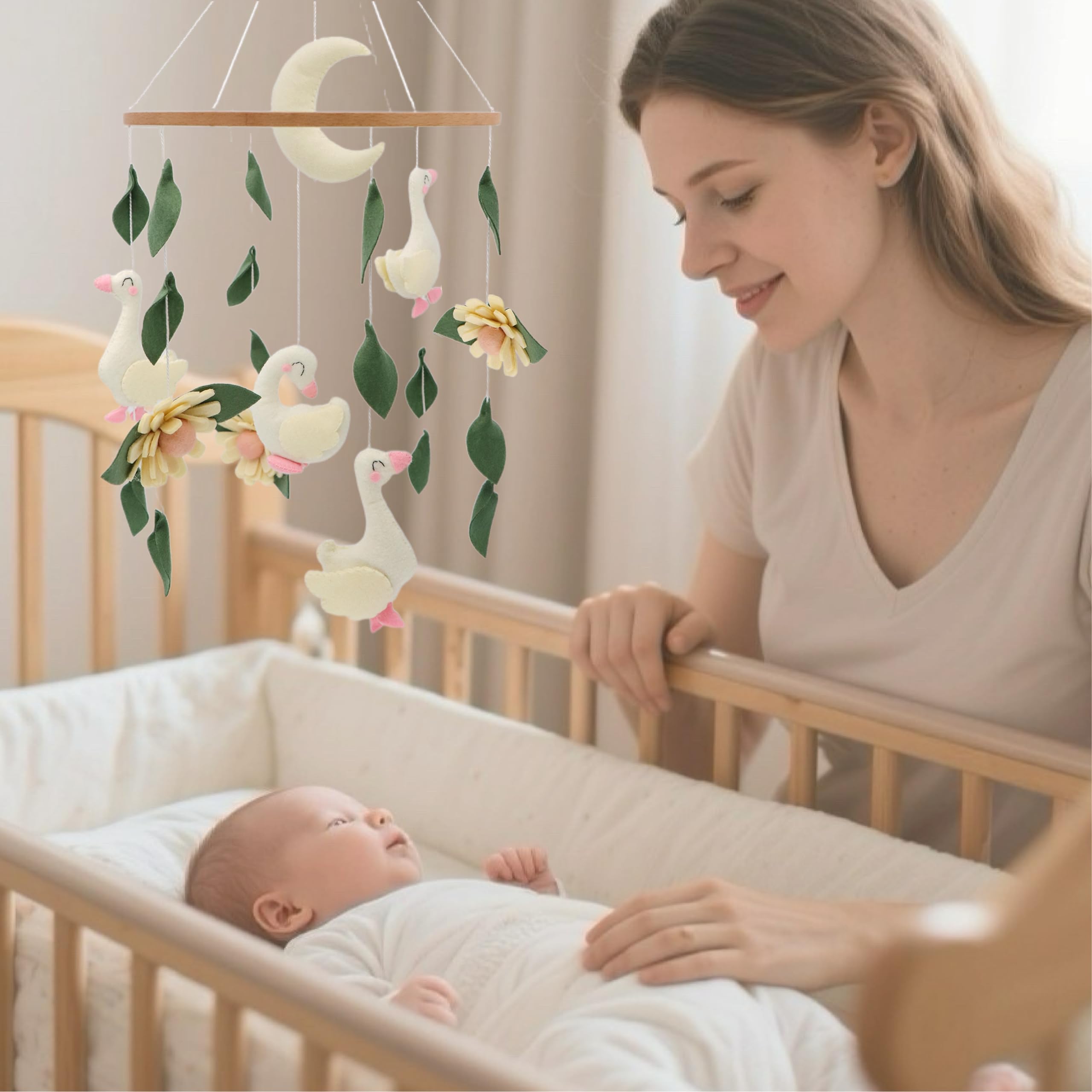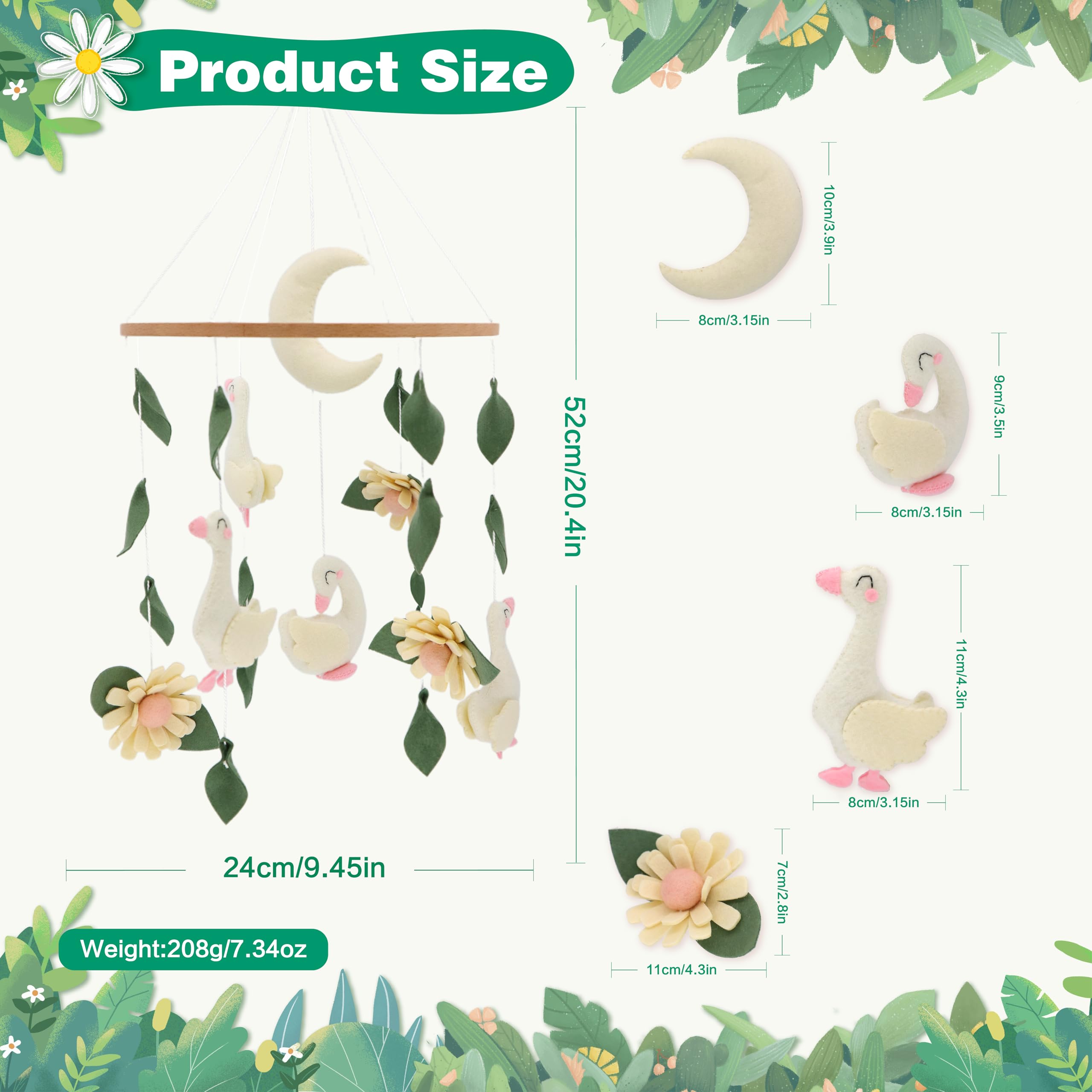 🪿Goose for a Nursery Fairytale: Transform your little one’s crib into an swan retreat with our Goose Themed Baby Mobile! Our Goose mobile for crib features adorable Goose baby crib mobile elements—goose, moon, Green Leaf and daisy. This whimsical mobile features graceful swans gliding verdant green leafs, bright moon and dainty daisys. The soft ivory, blush, and emerald green palette creates a dreamy, soothing atmosphere—perfect for lulling your baby to sleep while nurturing their sense of wonder.