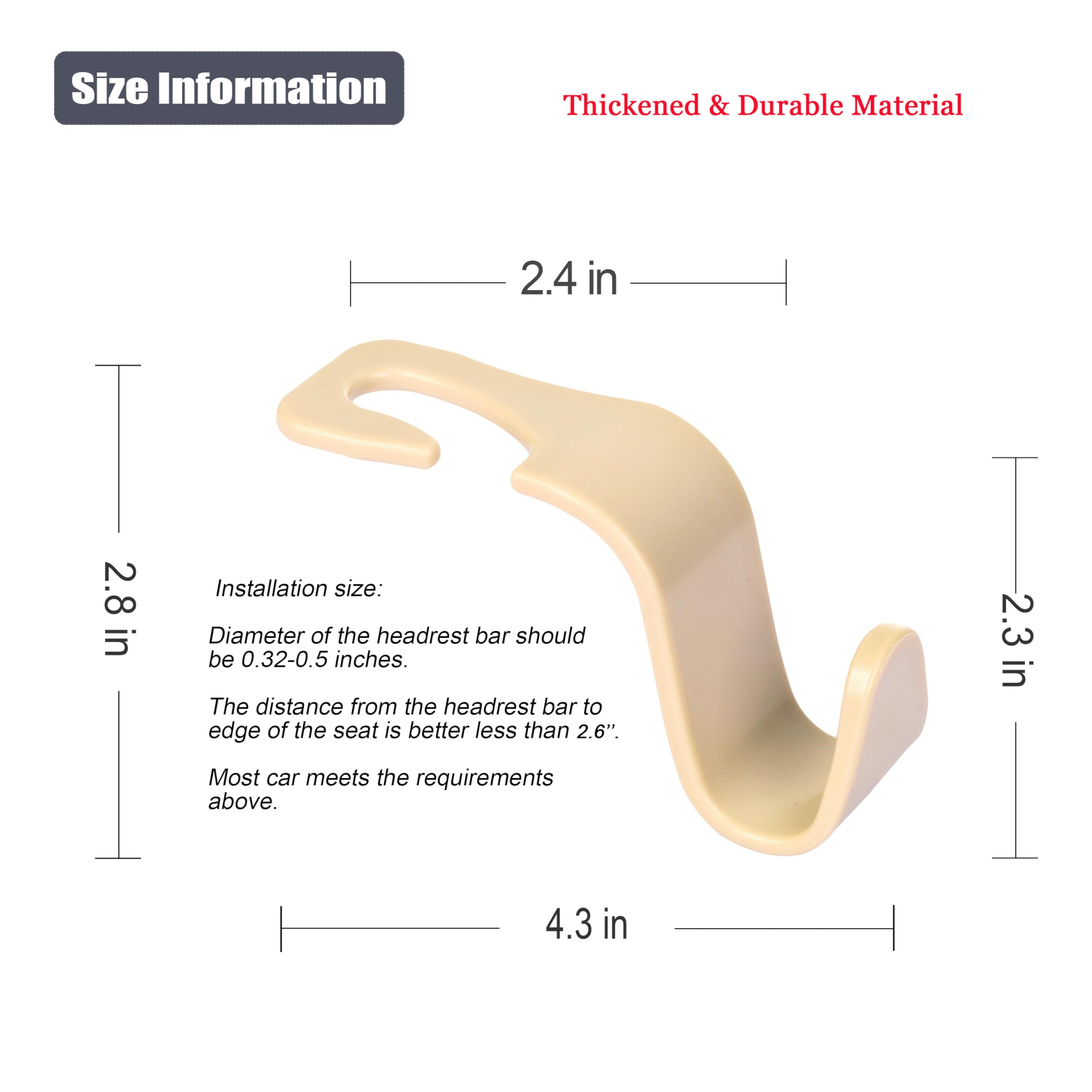 Easy to install: easy remove, easy installation. The car headrest hook with simple design, do not need to take off the headrest, no tools required.