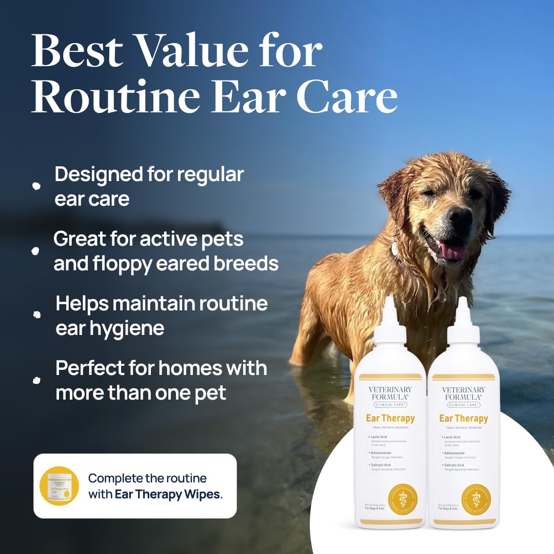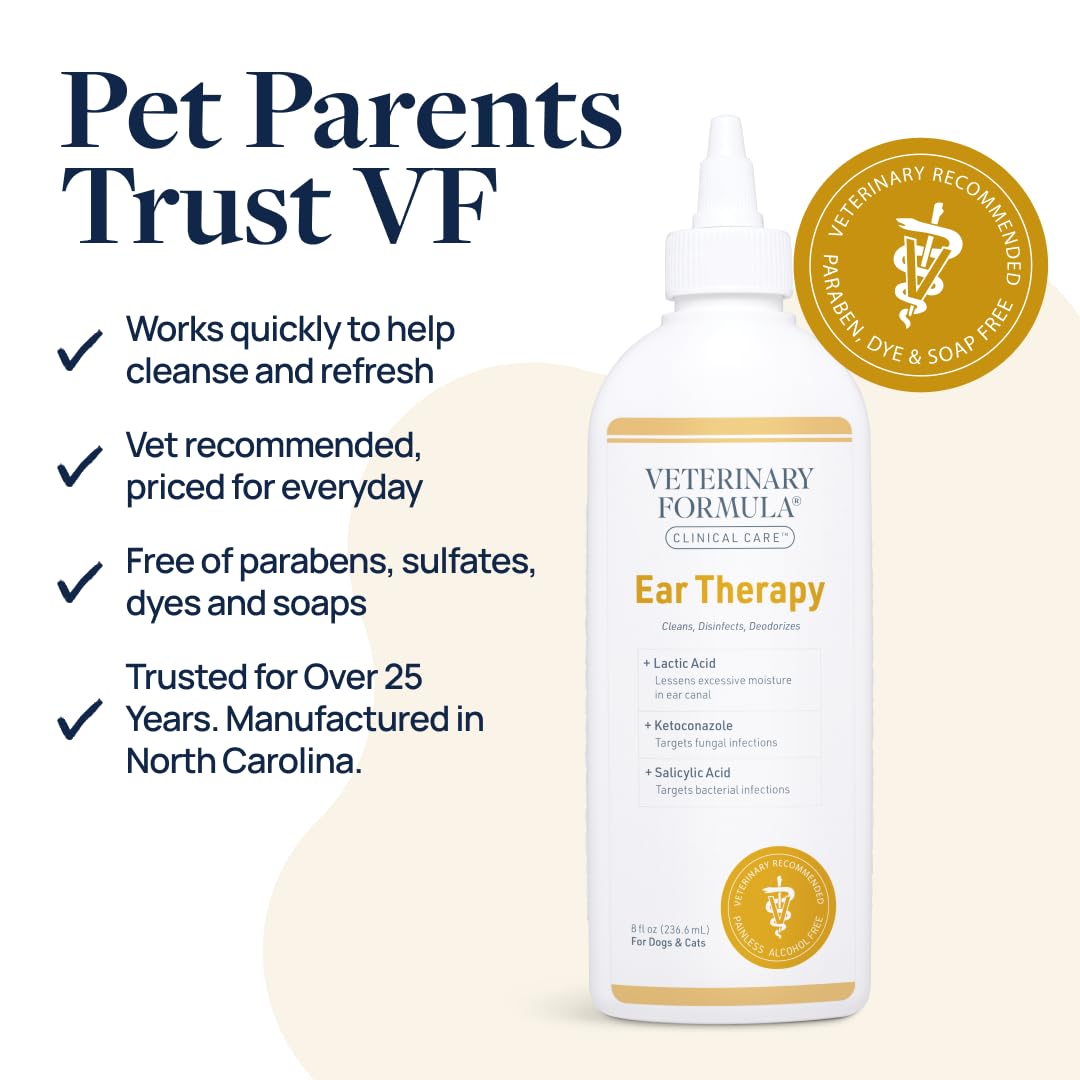 Keep your pet’s ears clean and comfortable with Veterinary Formula Clinical Care Ear Therapy. This gentle ear cleaner for dogs and cats helps remove excess wax and surface buildup that can collect over time as part of everyday life. The alcohol free formula is suitable for regular use, making it a dependable choice for routine ear hygiene. Ideal for use after bath time or following swims, Ear Therapy helps support clean, refreshed ears when moisture or debris may remain in the canal. Regular maintenance promotes overall ear comfort and helps maintain a consistent grooming routine at home. Developed by pet care experts, the Veterinary Formula Clinical Care line is designed to support routine health and hygiene with thoughtfully selected ingredients. This easy to use ear cleaner fits seamlessly into your pet’s everyday care.