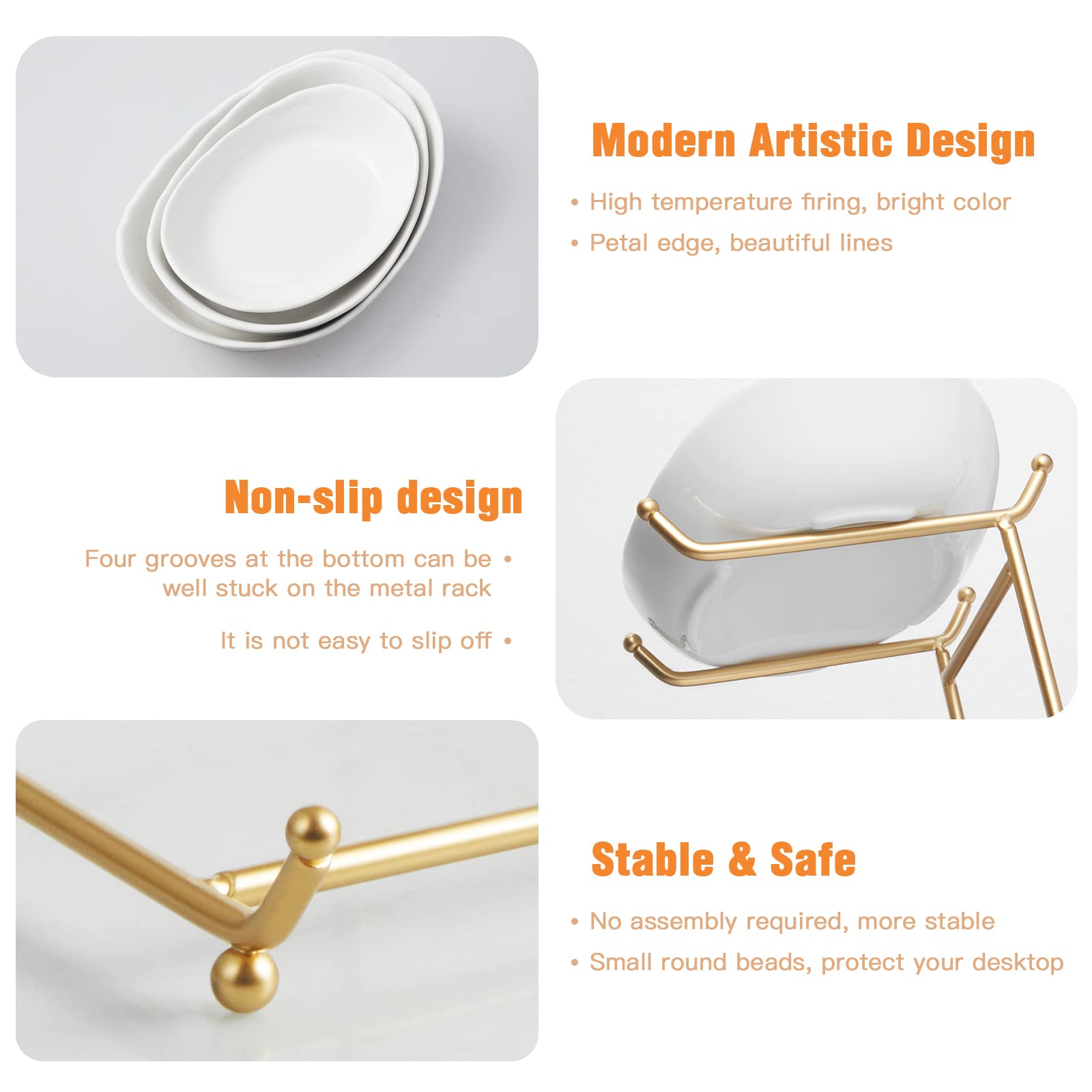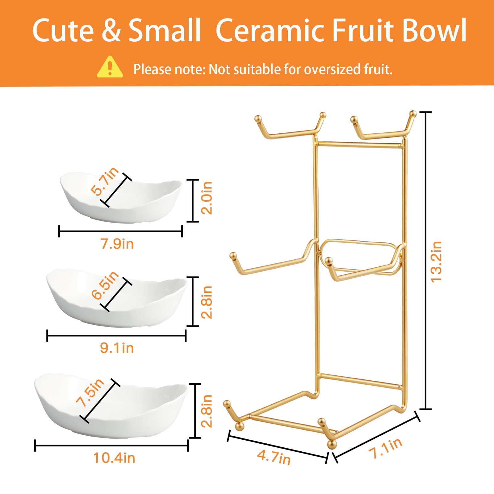 ❤【Small & Cute Fruit Bowls Save Space】: You will get a high-quality 3-tier fruit plate (LxWxH: 10.5x7.5x14.5 inches), including 1 large ceramic bowl (10.4x7.5x2.8 inches), 1 medium ceramic bowl (9.2x6.5x2.5 inches), 1 small ceramic bowl (8x5.8x2 inches) and a gold metal stand. Not suitable for large fruits.