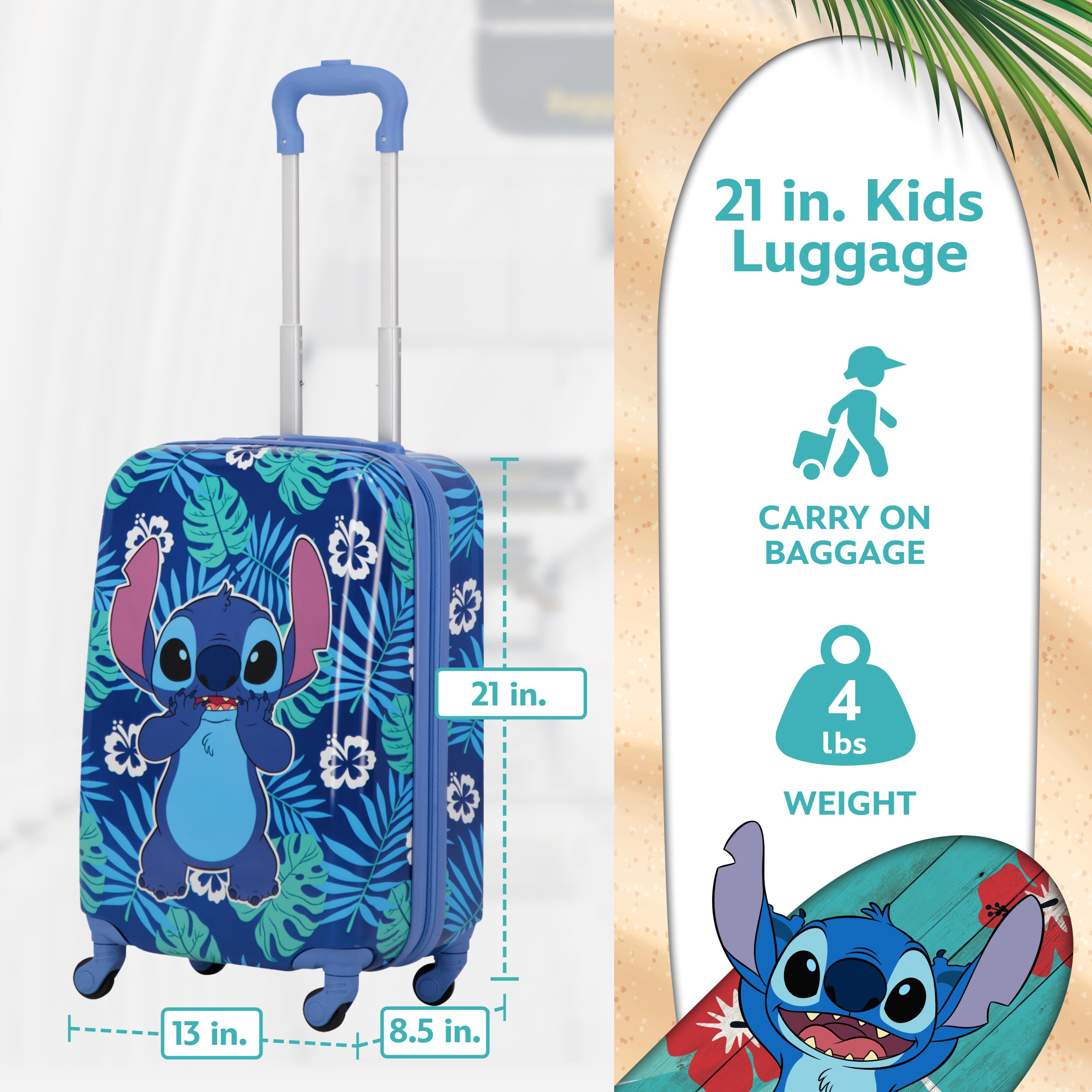 STITCH TRAVEL LUGGAGE: This cute and stylish hardshell luggage for boys and girls features your favorite alien Stitch standing against a blue background with tropical leaves, making this a perfect gift for the Lilo and Stitch fan in your life, and is perfect for all of your travel needs, with dual zippers to keep your valuables safe and secure inside; this hardshell luggage carrier meets most airline requirements for carry-on luggage and fits into most overhead bins
