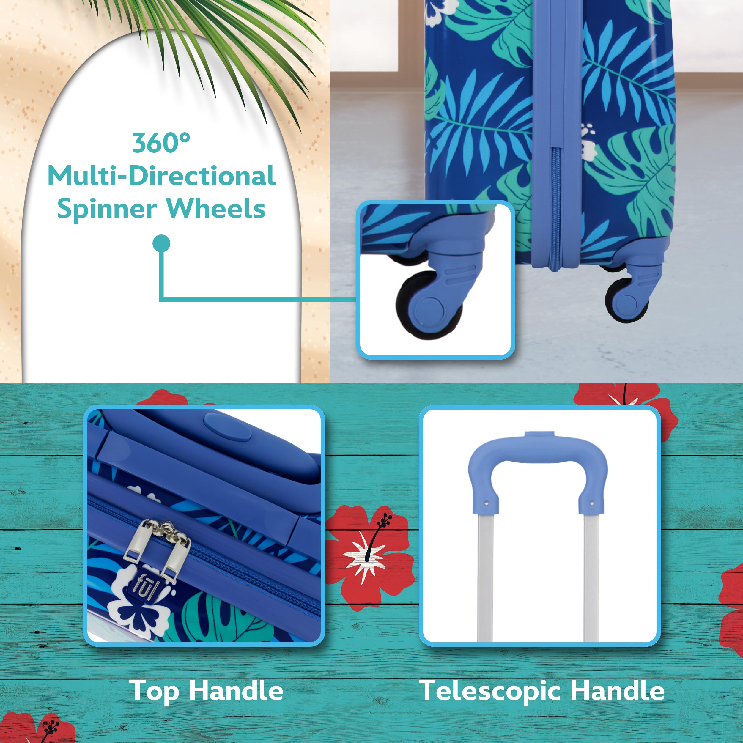 Description Keep your belongings conveniently and efficiently stored in one place while breezing through the airport or hotel lobby and give the perfect gift to the Lilo and Stitch fan in your life with this stylish Stitch rolling luggage on wheels. Constructed with a stylish, eye-catching image of Stitch standing against a blue background with tropical leaves, this hard shell carry on luggage features 4 360 degree multi-directional spinner wheels which allow for smooth travel over all types of textured surfaces, and the lightweight hard sided luggage with spinner wheels features a retractable pull handle so you can reach your destination without hassle. The hard case luggage for boys and girls features a sizable polyester-lined main zip compartment divided for easy packing of your belongings, and clothing compression straps to keep clothing from wrinkling. The light weight carry on luggage roller features a hard shell polycarbonate and ABS plastic case which protects your hardcase luggage and is easy to spot clean to keep the carry on luggage with wheels looking stylish during travel. The travelling bag with wheels measures 20.5 H x 13 W x 8.5 D in inches, and weigh 4 lbs, fitting within airline approved carryon luggage size guidelines. Hard side luggage is backed by a 5 year warranty.