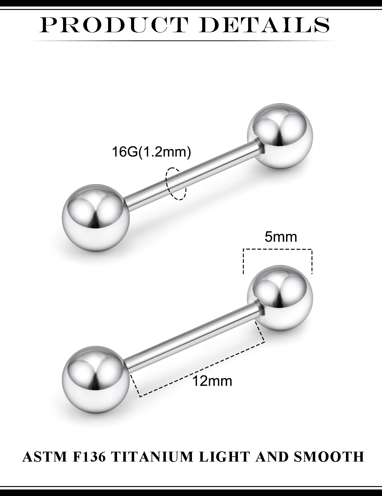 【Perfect size】: Straight barbell nipple tongue rings piercing jewelry gauge: 16G(1.2mm), bar length: 1/2 inch(12mm), top ball size: 5mm, color: silver