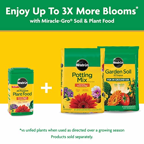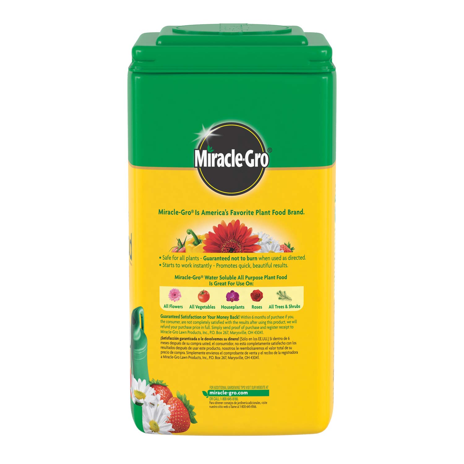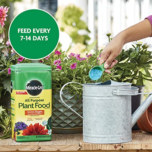 Grow bigger and more beautiful plants (vs. unfed plants) with Miracle-Gro Water Soluble All Purpose Plant Food. This gardening product feeds plants instantly. In addition, it's safe for all plants and won't burn plants when used as directed. Use with all types of indoor or outdoor plants, including flowers, vegetables, houseplants, roses, trees, and shrubs. This plant food may be used with container plants or in-ground gardens. It's great to use in vegetable gardening and flower gardening. To apply to indoor plants, use the small end of the included scoop (1/2 tsp) and mix plant food with 1 gallon of water in a watering can. Reapply every 2 weeks. For outdoor plants, use the large end of the included scoop (1 1/2 tbsp) and mix with 1 1/2 gallons of water in a watering can. Reapply every 7 to 14 days. When using as part of a plant care routine in large garden areas, fill a Miracle-Gro Garden Feeder (sold separately) and follow feeder directions. For best results, just soak the soil at the base of each plant to nourish the roots and feed plants. One 5.5 lb. container of Miracle-Gro Water Soluble All Purpose Plant Food feeds approximately 2,200 sq. ft. of garden area.